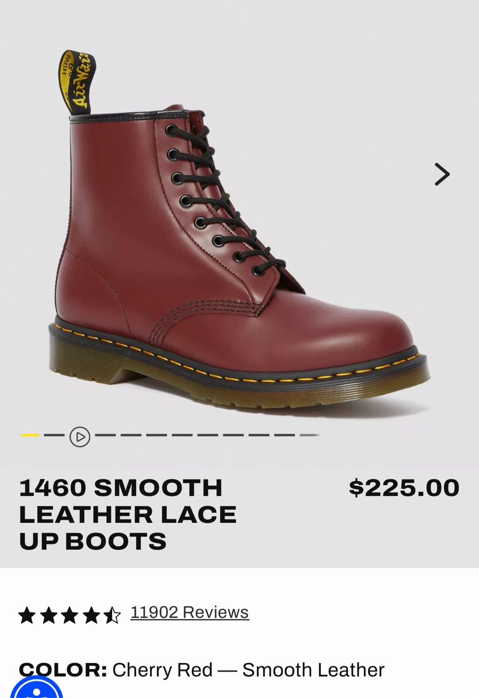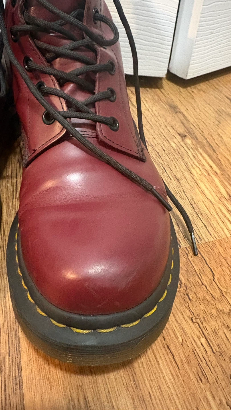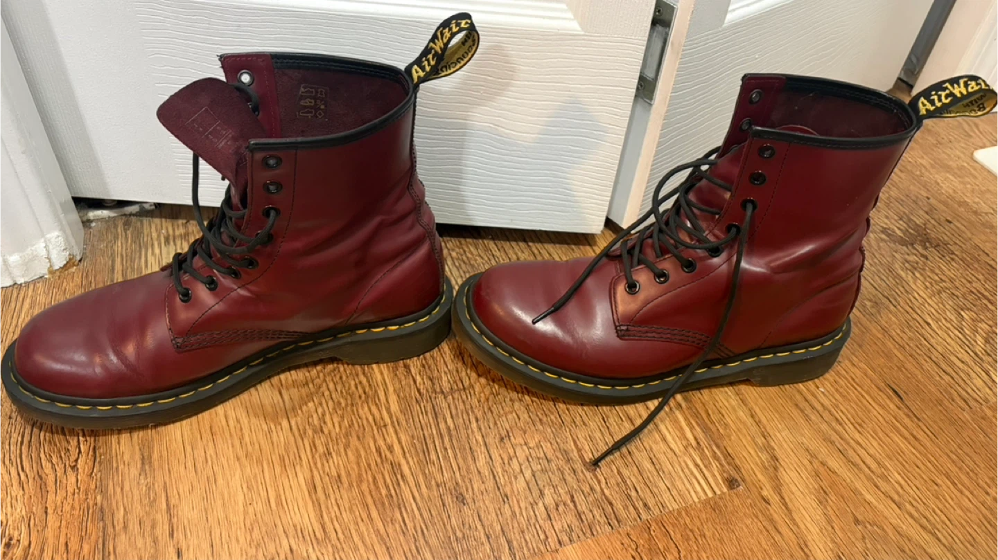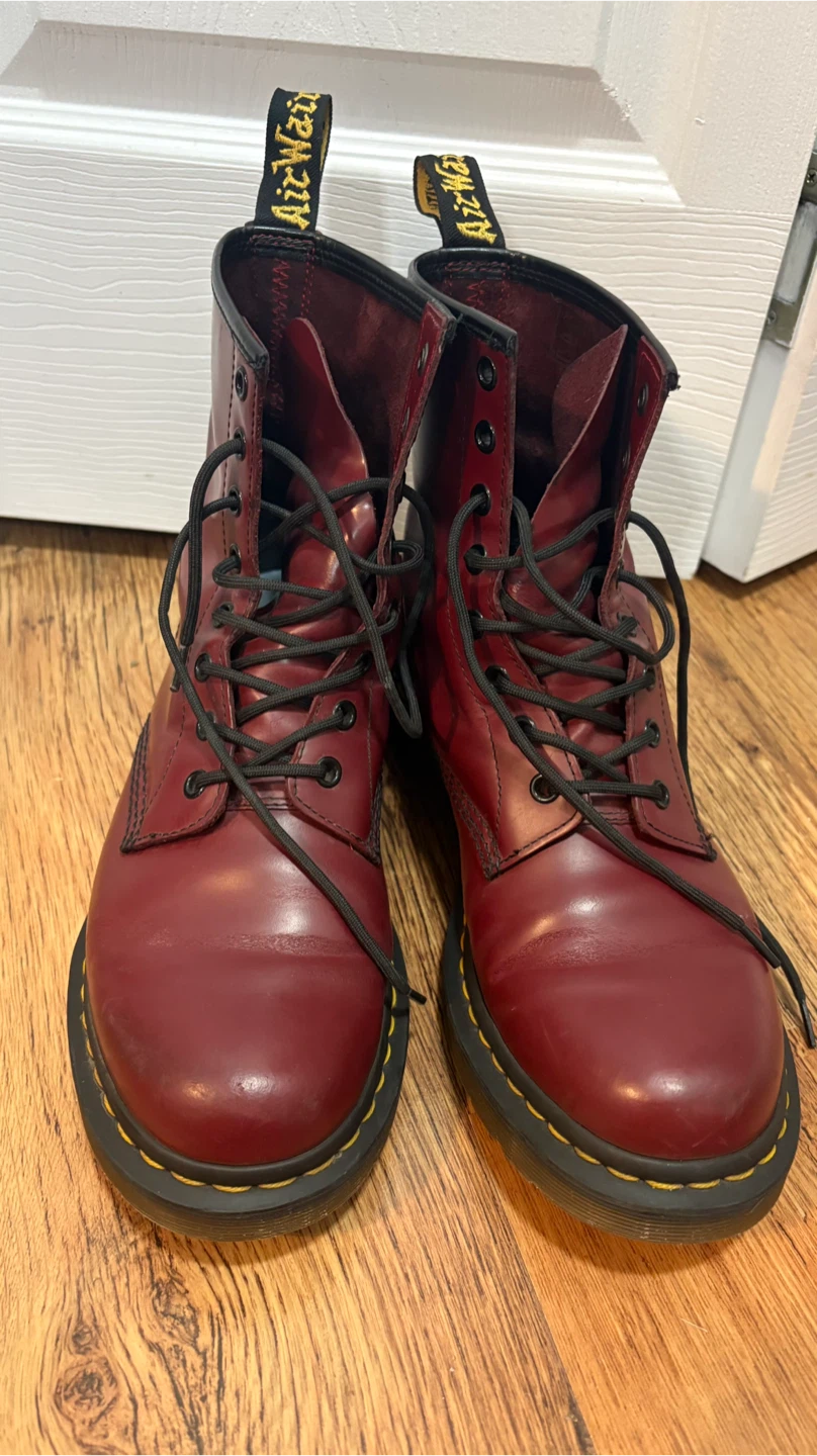 Classic Dr. Martens 1460 boots in cherry red smooth leather. These iconic lace-up boots feature the signature yellow stitching and durable air-cushioned sole. Great for everyday wear!
