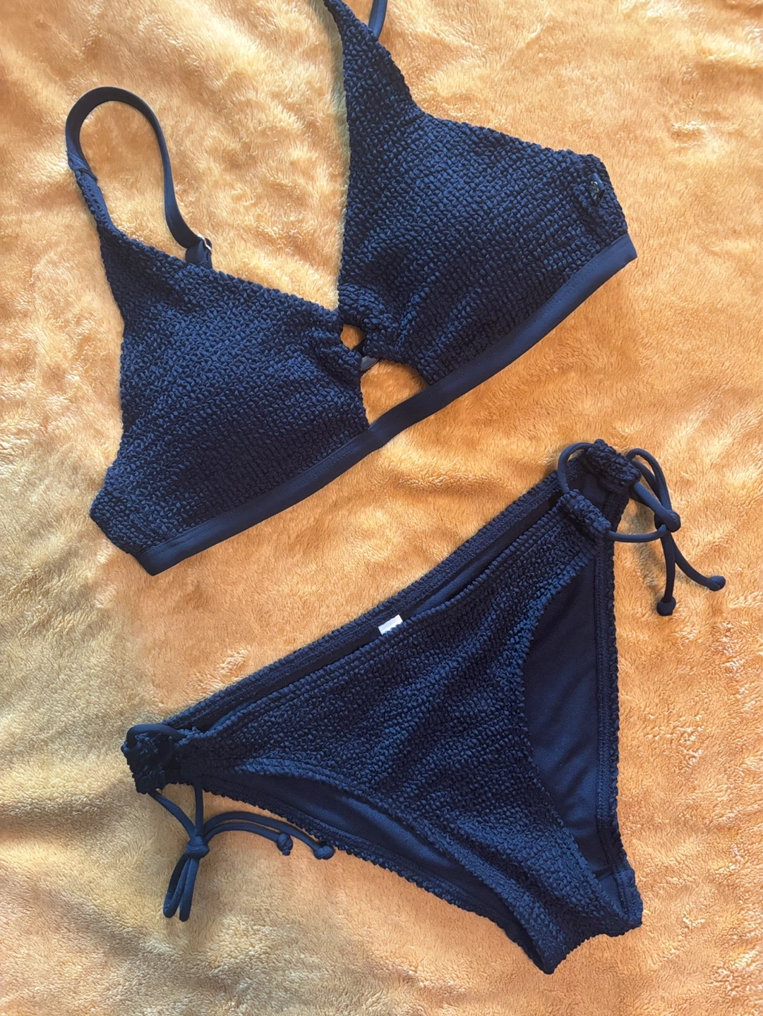 Black textured bikini set. The top has adjustable straps and a hook-and-eye closure. The bottoms feature adjustable tie sides. This two-piece is ready for your next beach trip!