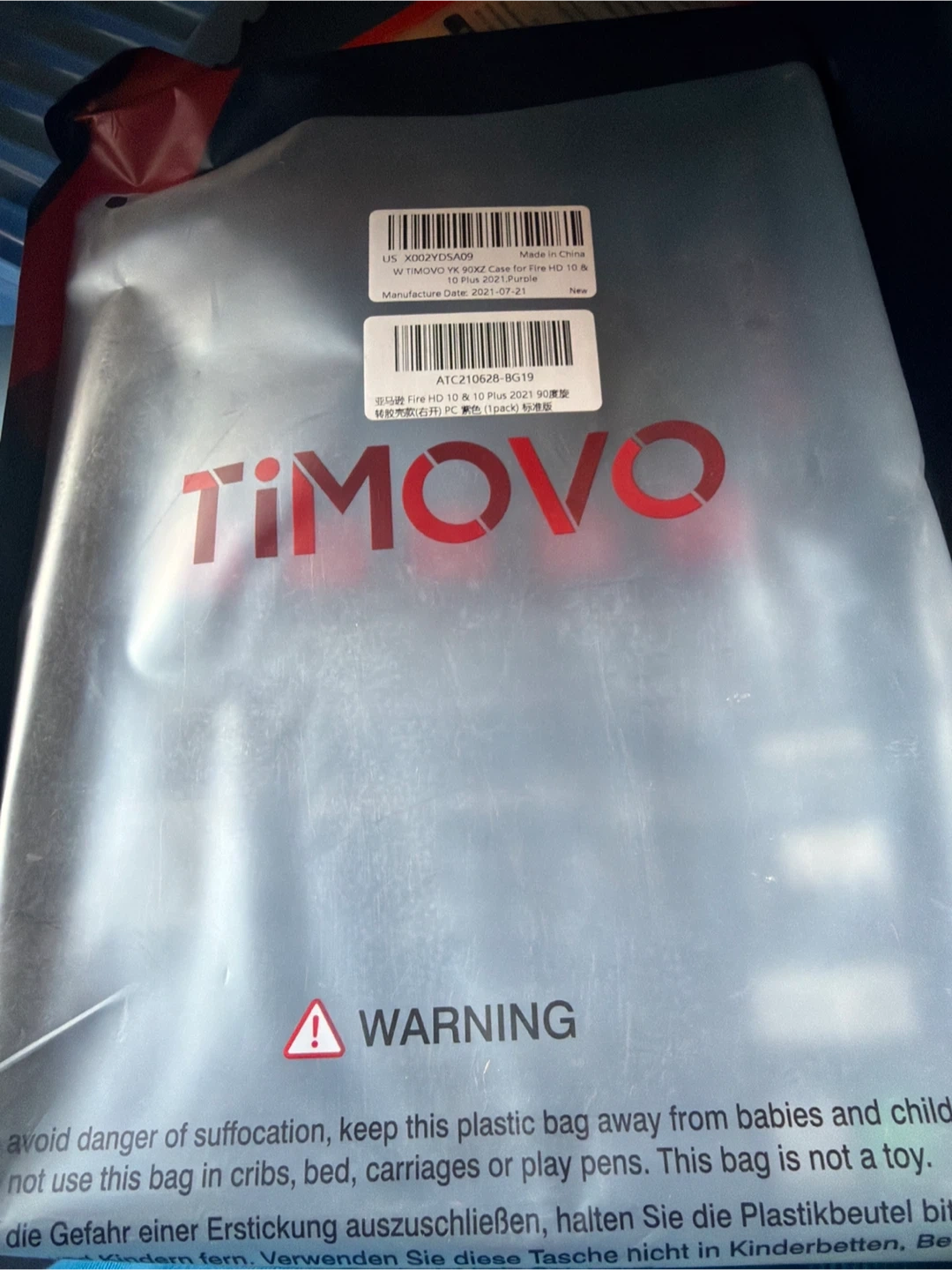 This TiMOVO tablet case is designed for the Fire HD 10 (2021). It's a purple, faux leather cover. It has a stand feature for hands-free viewing. Includes protective packaging.