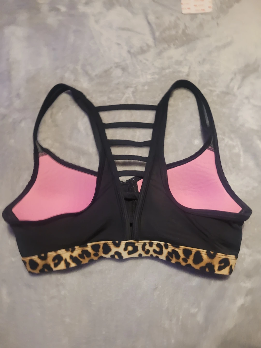 This PINK sports bra features a black and white polka dot design with leopard print trim. It has a strappy back detail for added style and support.