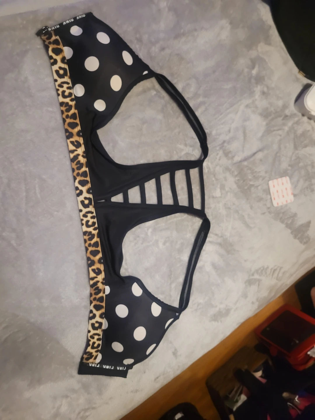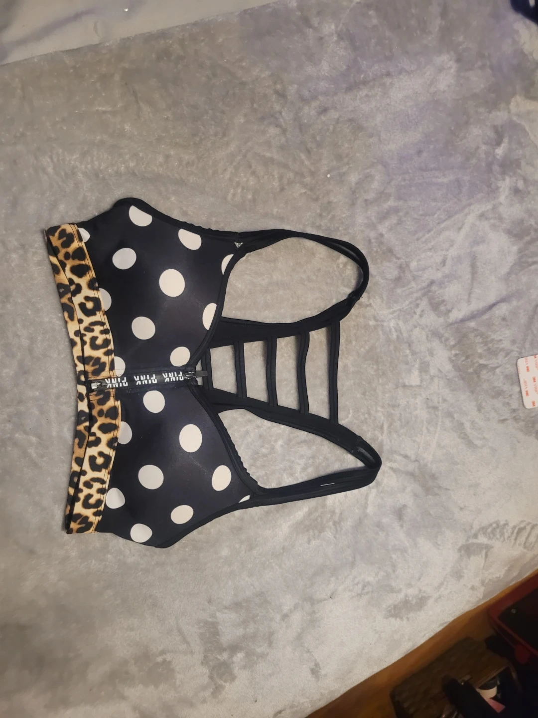 This PINK sports bra features a black and white polka dot design with leopard print trim. It has a strappy back detail for added style and support.