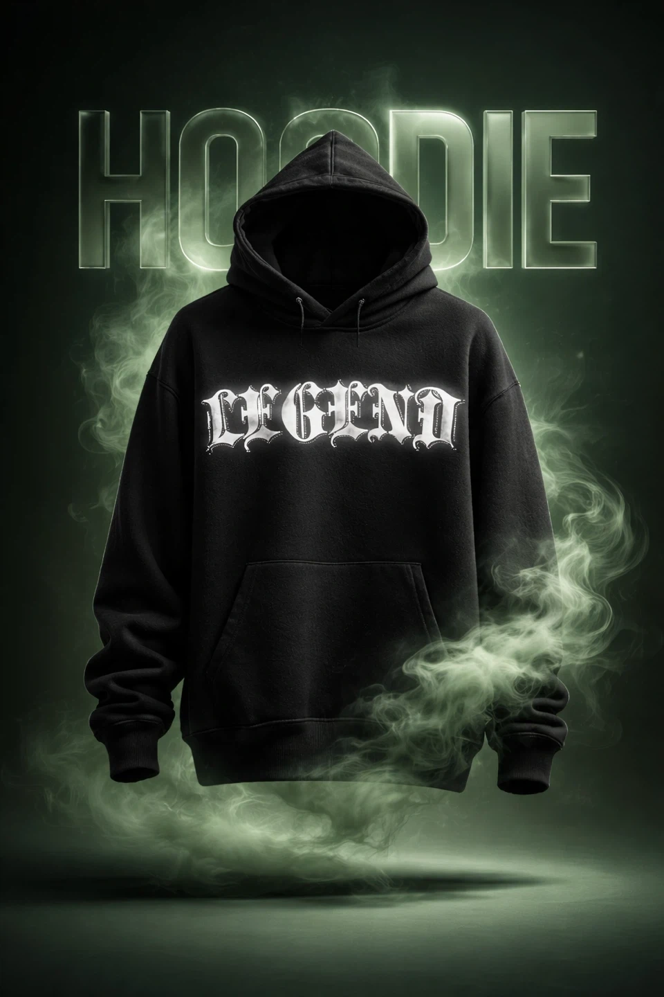 This is a black hoodie with "LEGEND" printed on the front. It's a comfortable, stylish piece perfect for everyday wear. The hoodie includes a front pouch pocket and a drawstring hood.