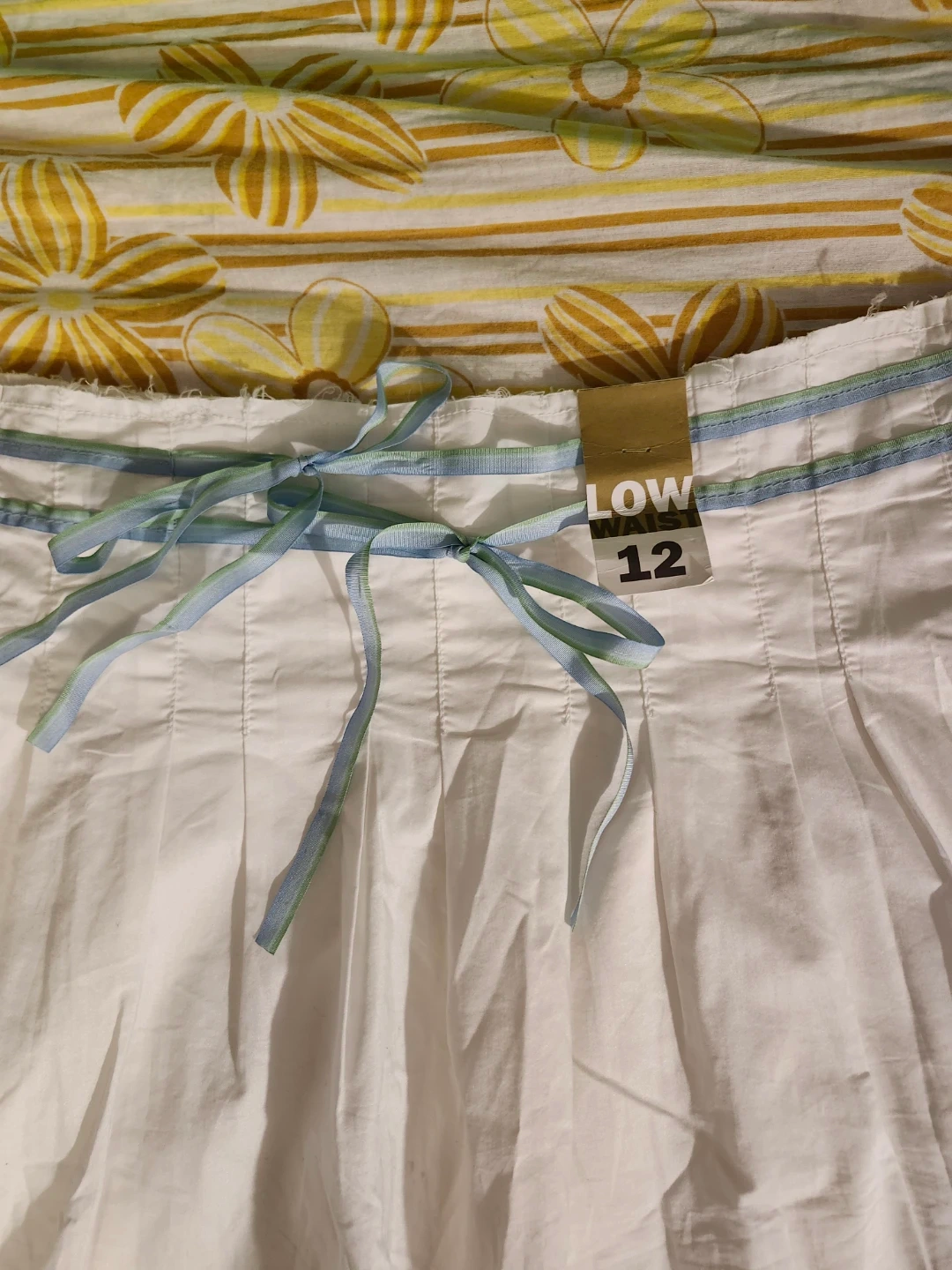 adorable NWT Spring 2006 Old Navy low-rise pleated a-line skirt. has a super cute re-tie-able ribbon detail along the top and a zipper closure on the side. has a cute semi raw hem.
