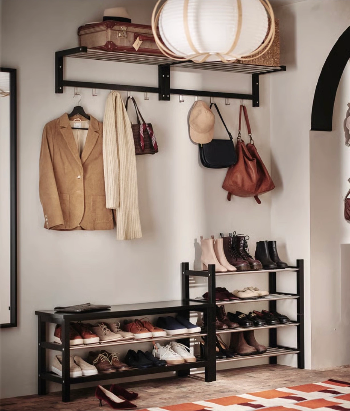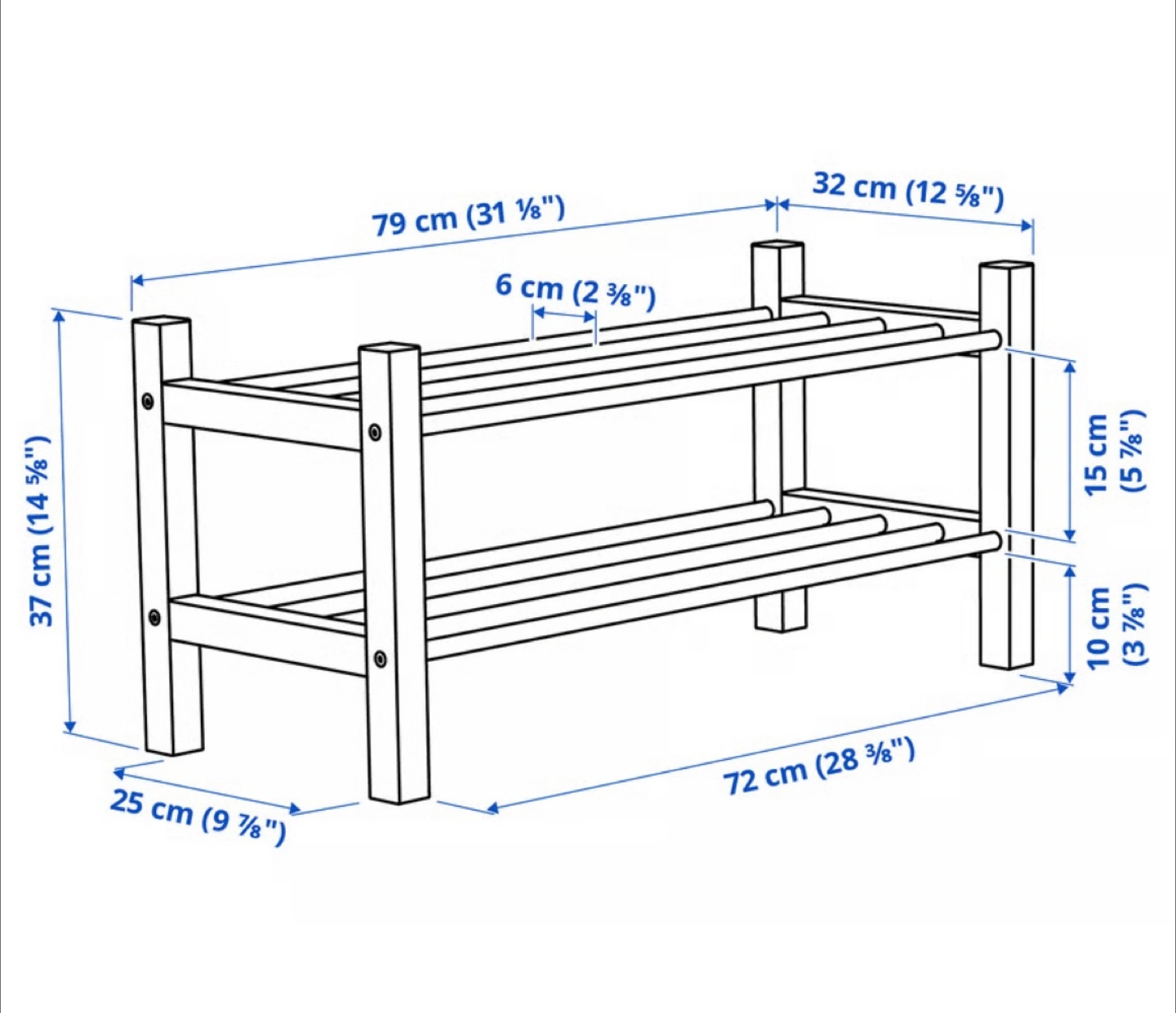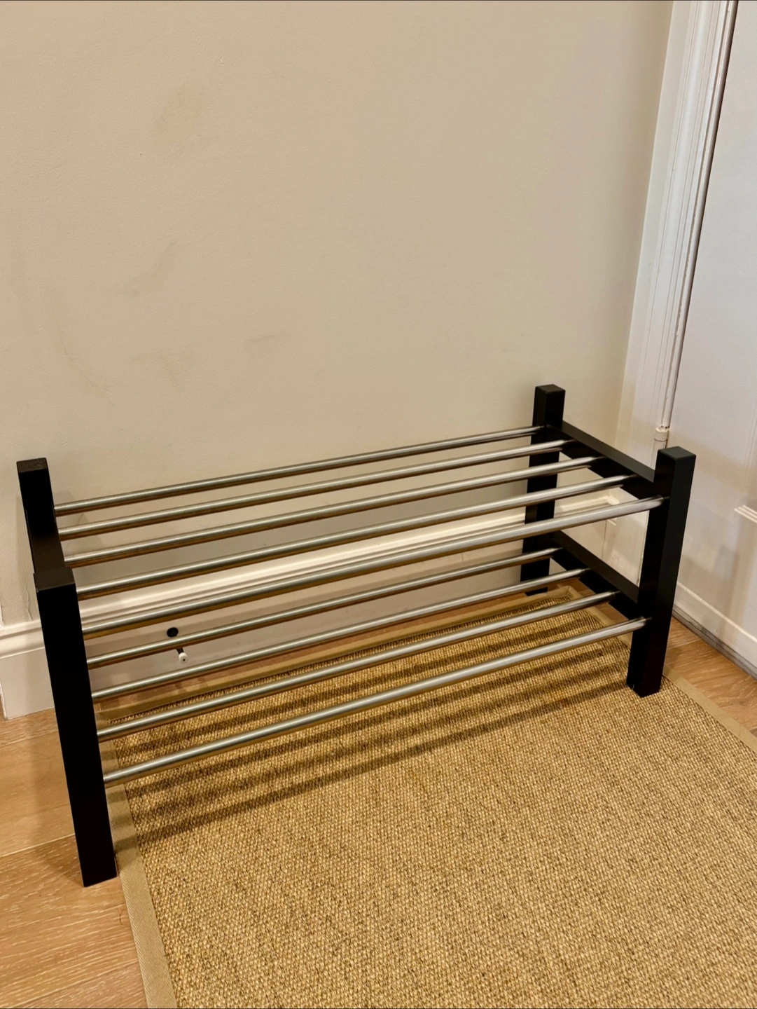 This IKEA TJUSIG shoe rack has two tiers for shoe storage. It's made of solid wood and steel. Perfect for keeping your entryway tidy! Dimensions: 79cm W x 32cm D x 37cm H.