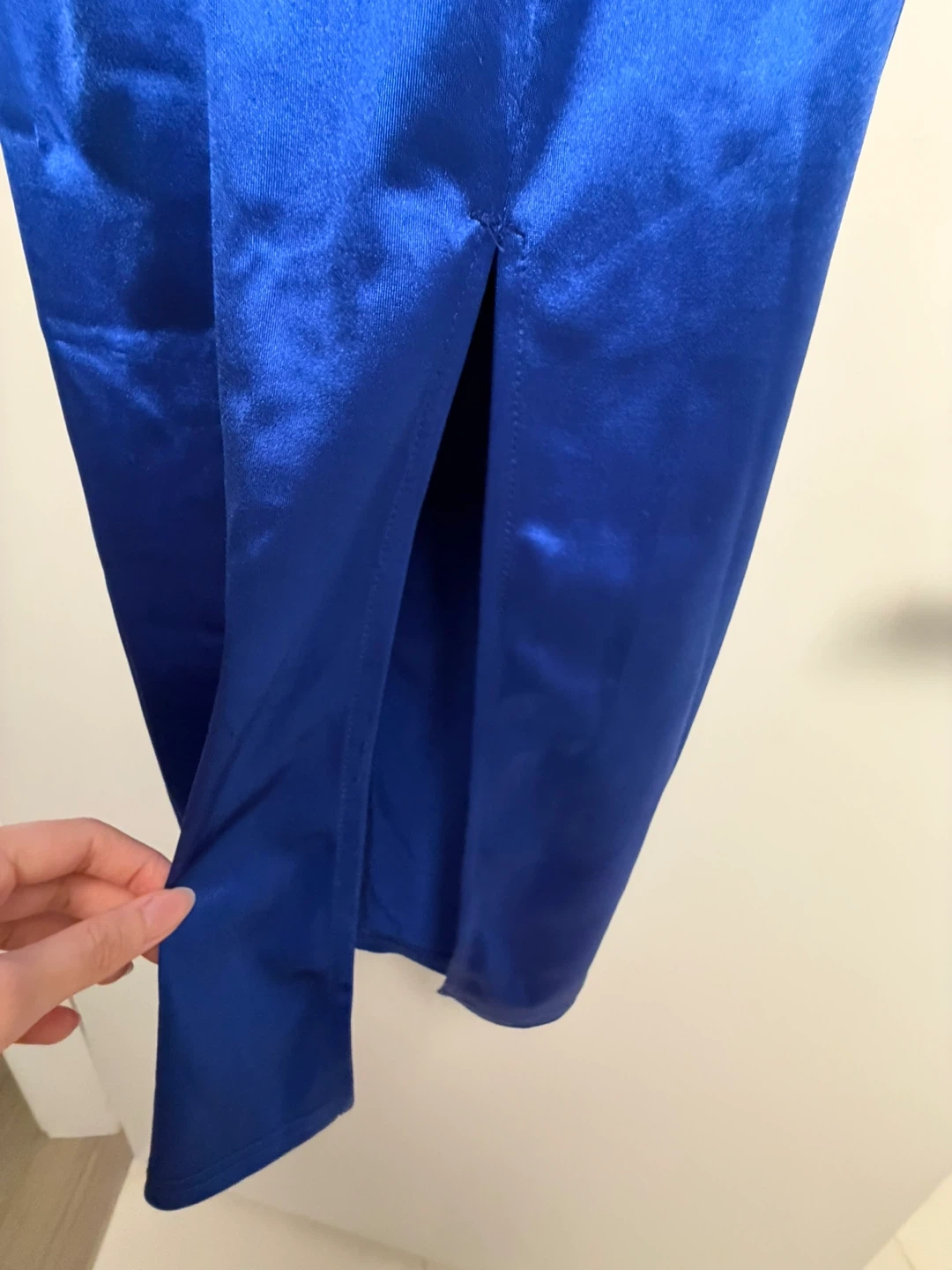 Sleek satin midi dress in a vibrant blue hue. It features spaghetti straps and a flattering side slit. Material is polyester.