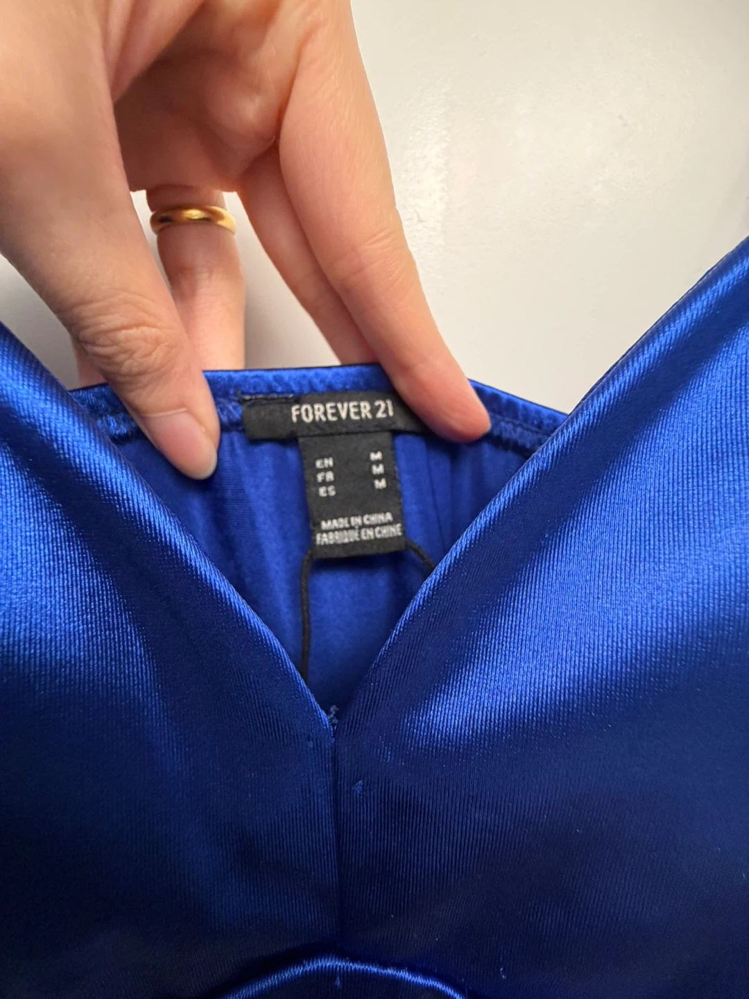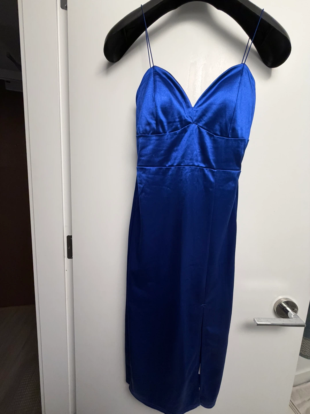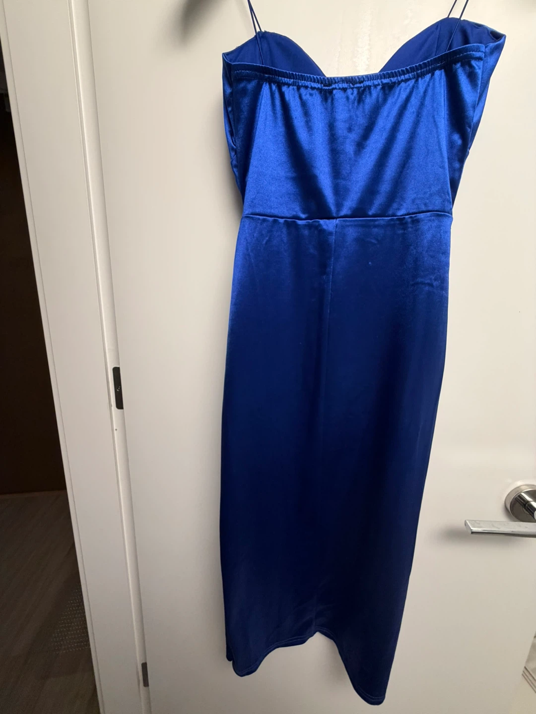 Sleek satin midi dress in a vibrant blue hue. It features spaghetti straps and a flattering side slit. Material is polyester.