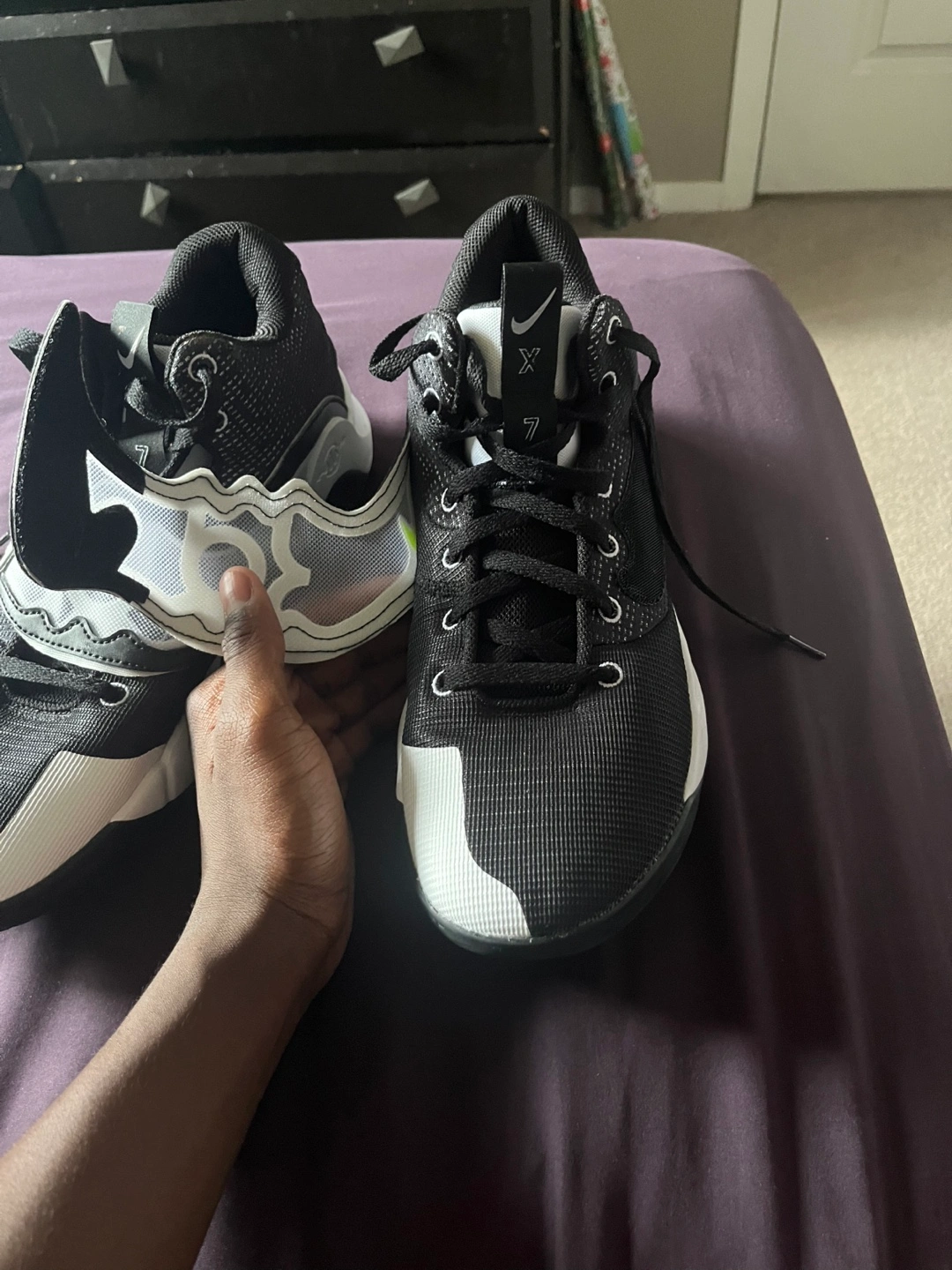 Selling a pair of used Nike KD 7s basketball shoes. These shoes are size 12.5, and they are in good condition. I have cleaned them thoroughly. Perfect for playing ball or just rocking around town. The black and white design with volt accents make these pop!