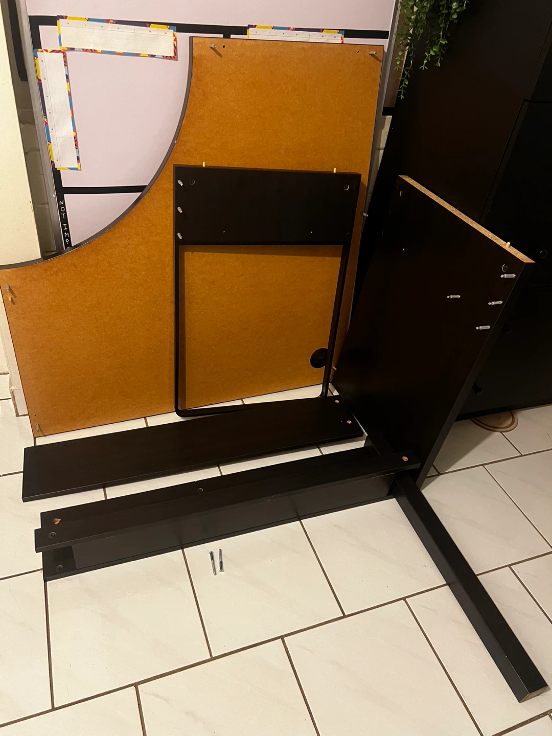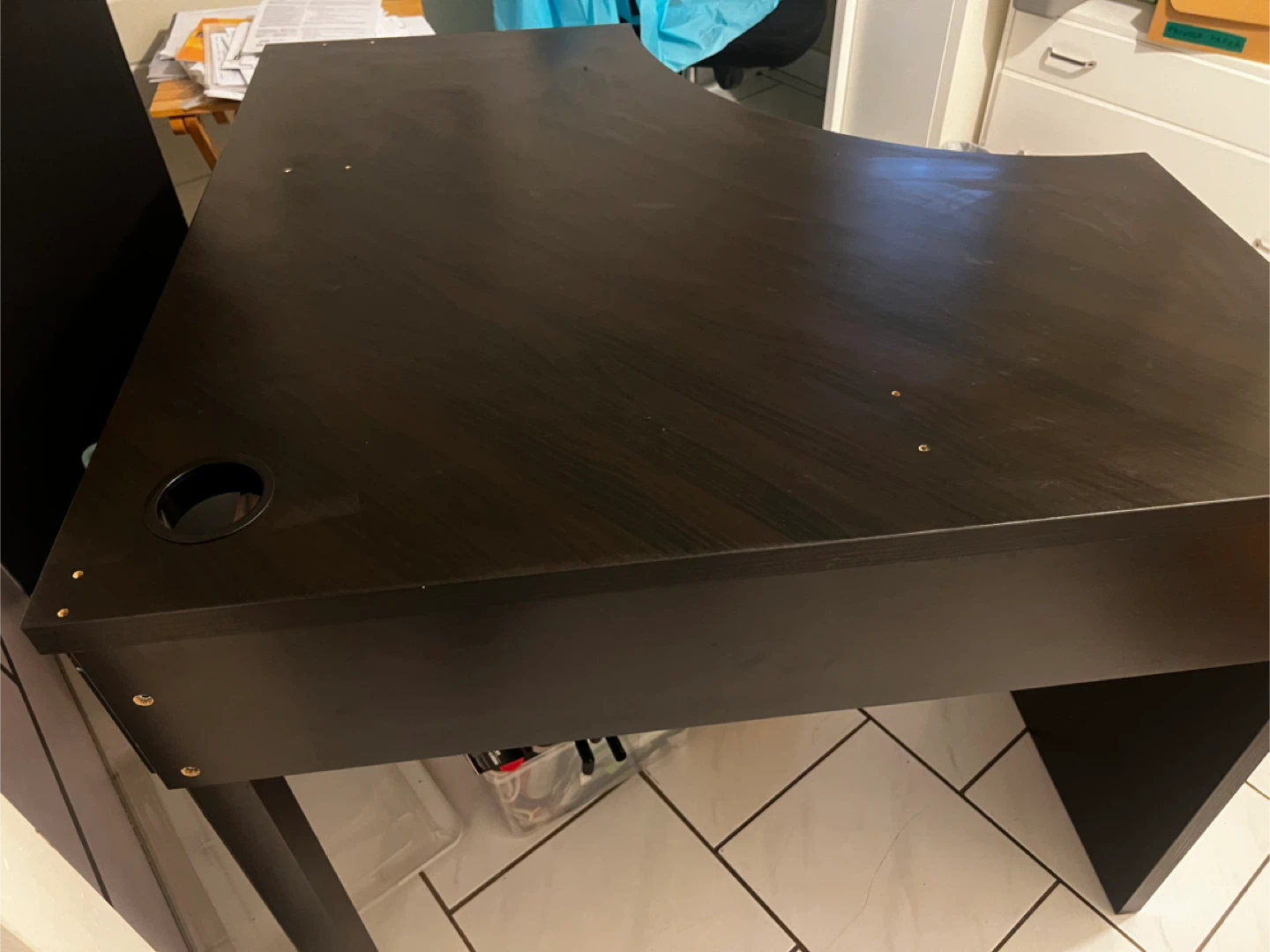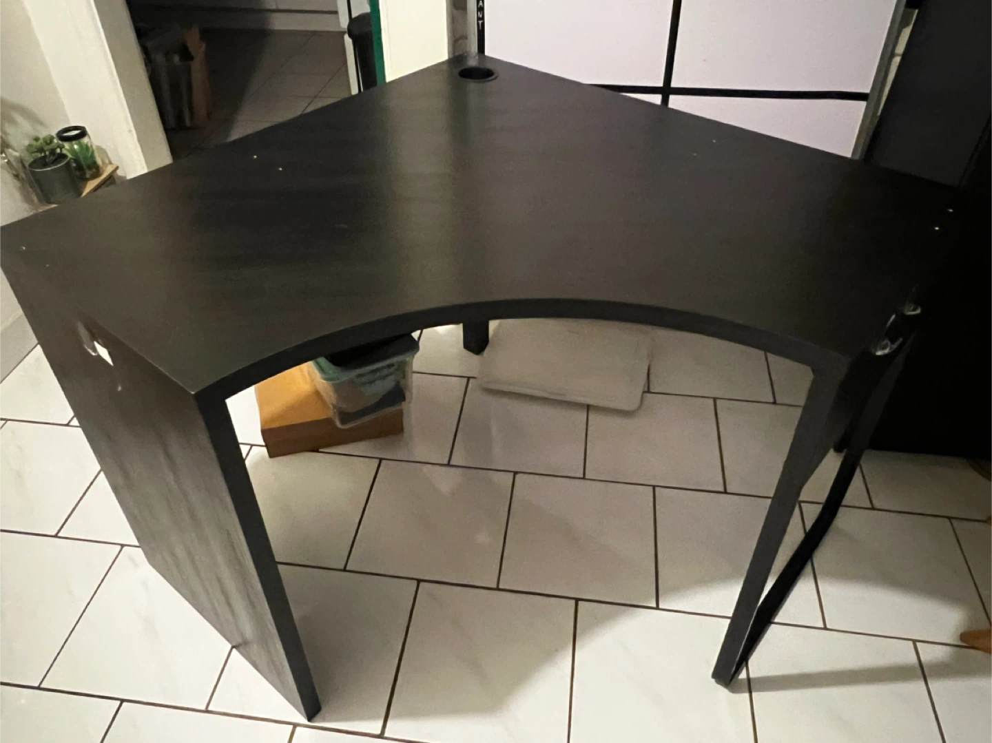 Free black corner desk, from pet/ smoke free home. It’s in good used condition. Has a hole and a a frame under the side for cable management. It’s very light and I took it apart for easy transport.