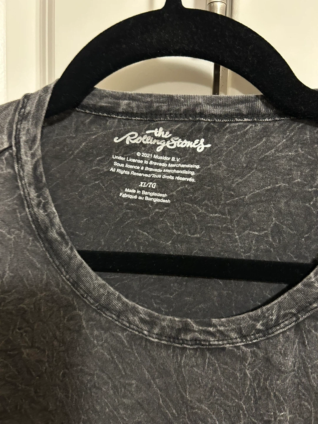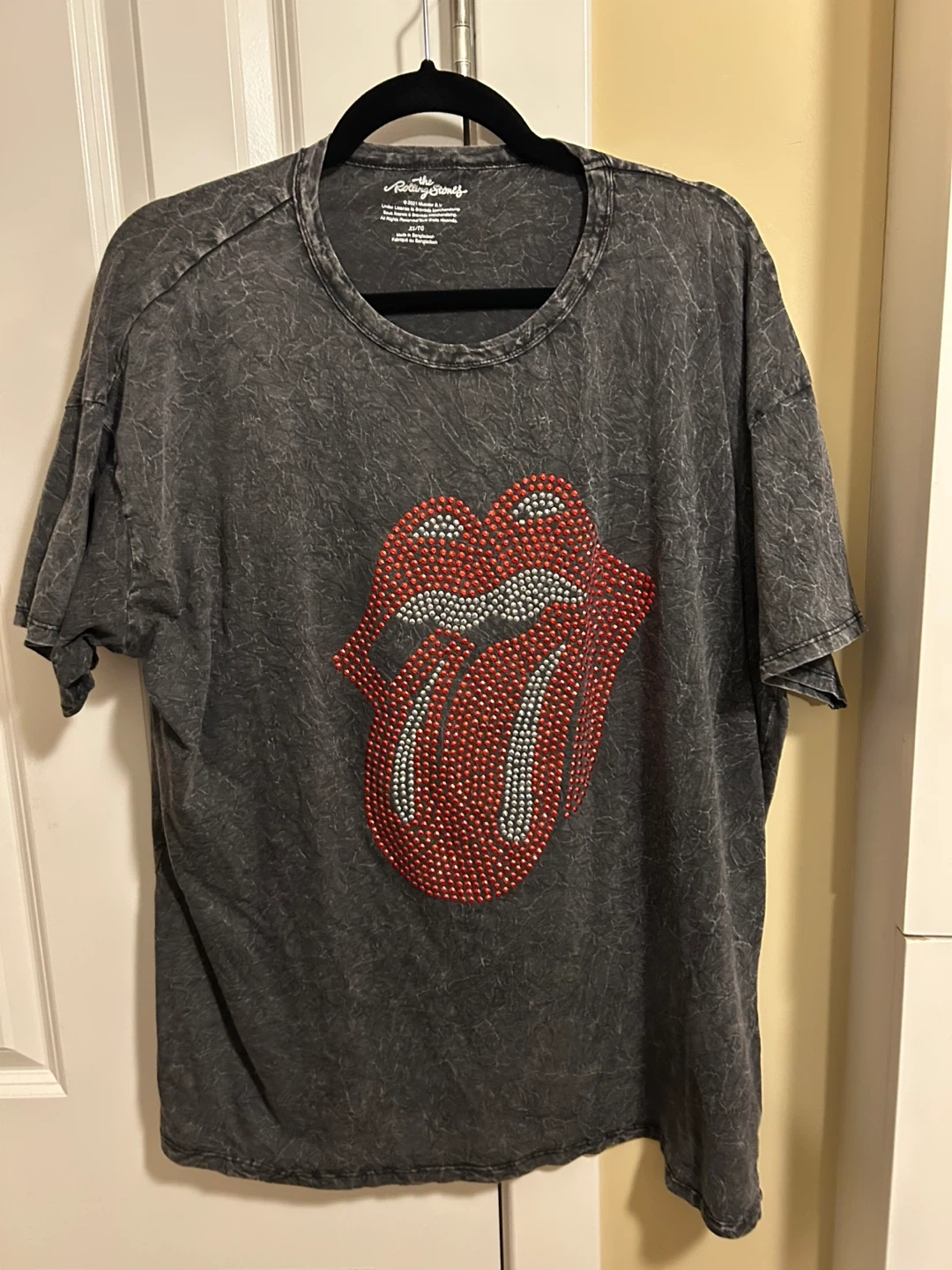 This is a grey wash t-shirt featuring the iconic Rolling Stones logo, embellished with red and silver rhinestones. It's a size XL/TG. Made in Bangladesh.