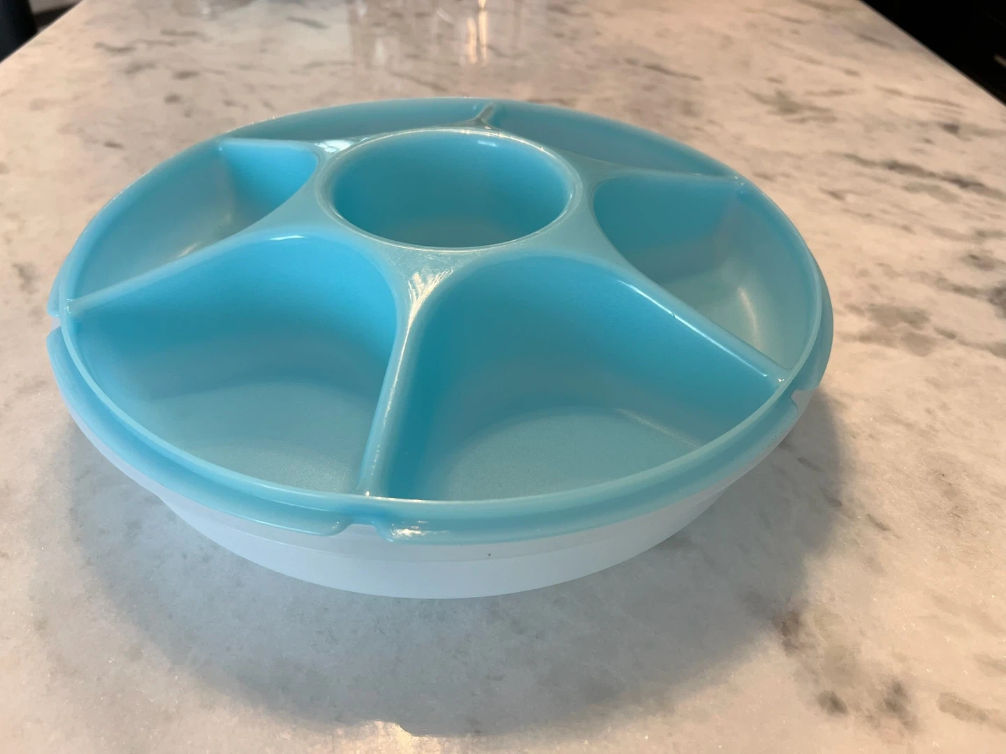 Blue and white plastic serving tray with five sections and a centre compartment. Lid included.