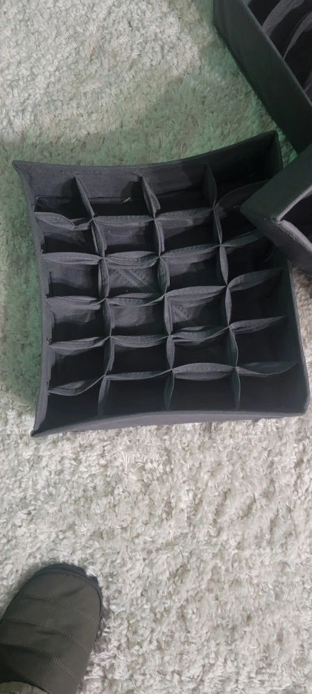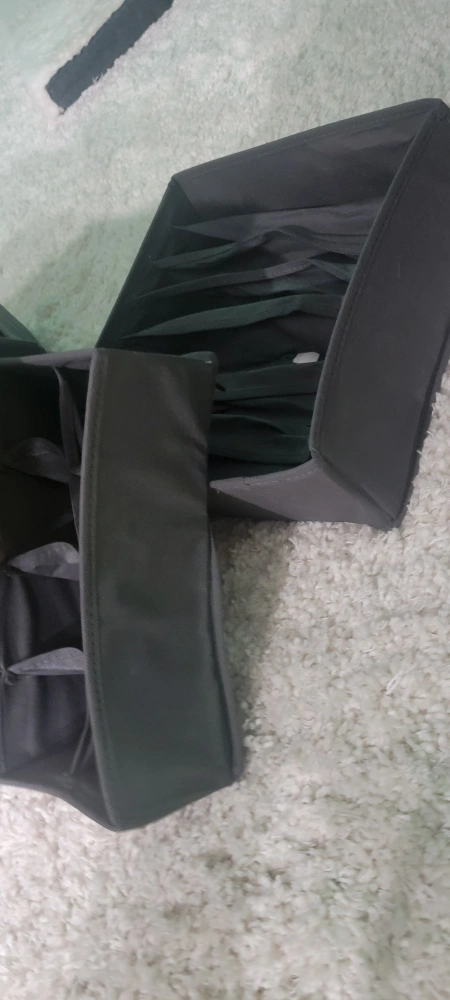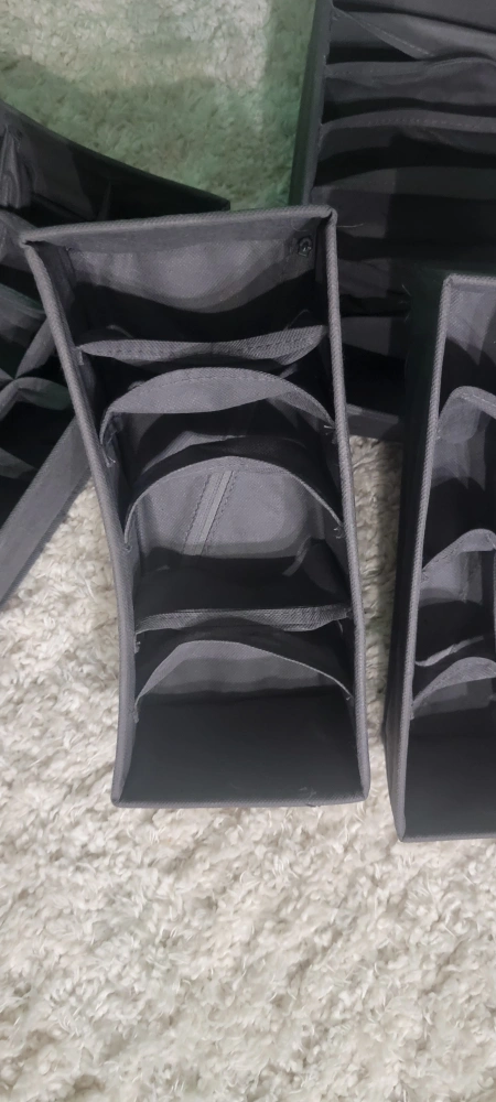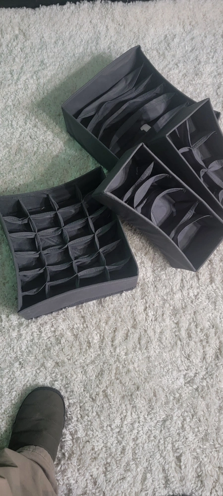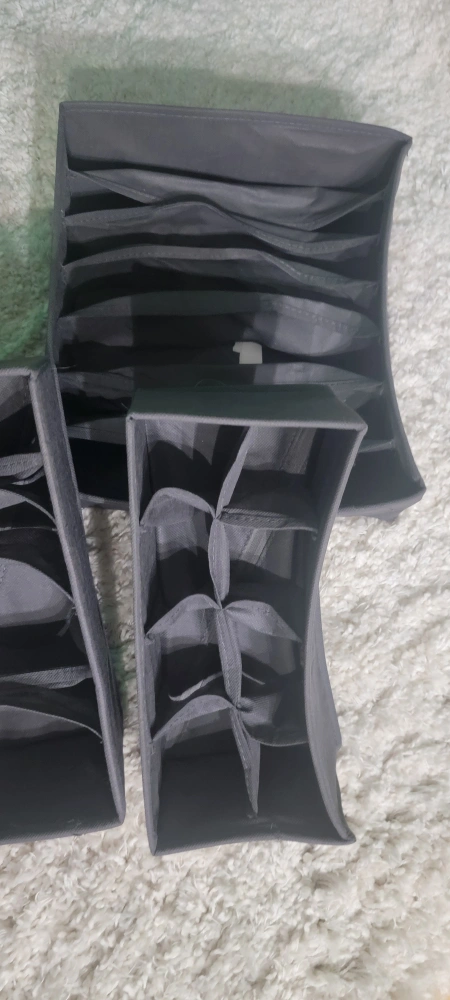 Three grey fabric drawer organizers. Great for organizing underwear, socks, or other small items. Curved design fits well in drawers.