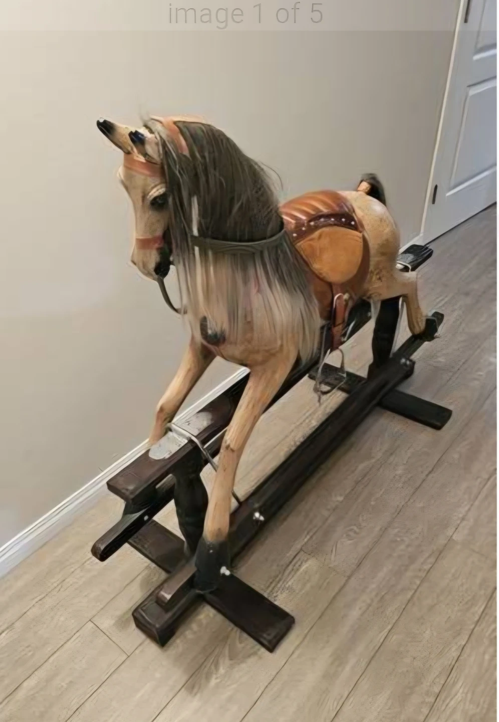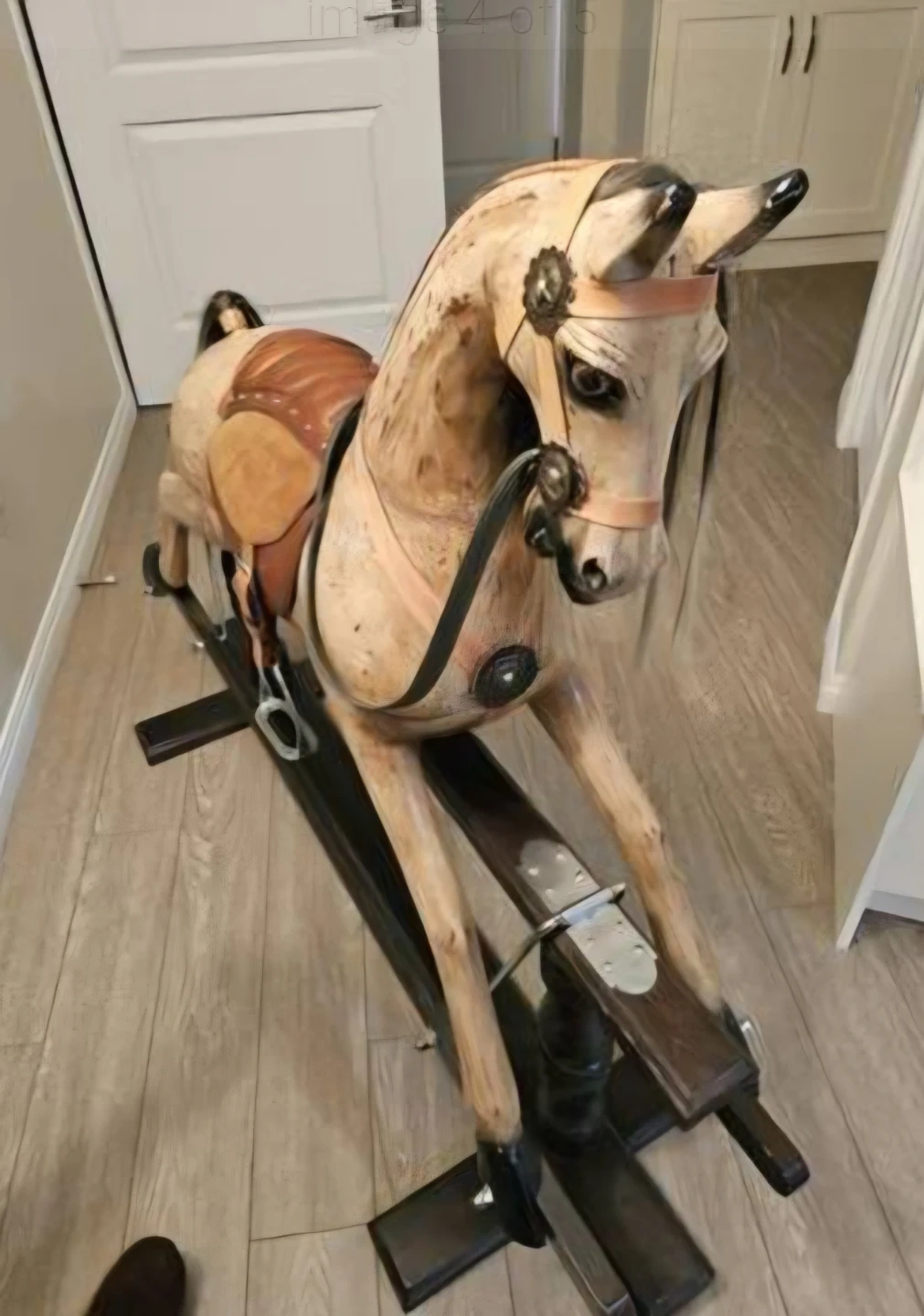 A classic wooden rocking horse with a vintage look. It features a brown leather-like saddle and reins. This horse is perfect for little ones to enjoy imaginative play or just for decor.