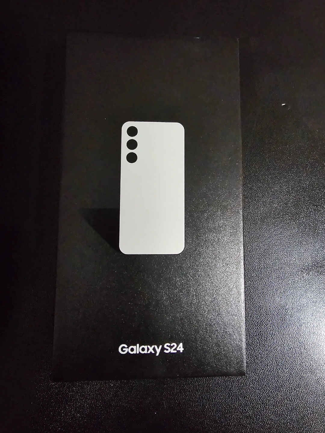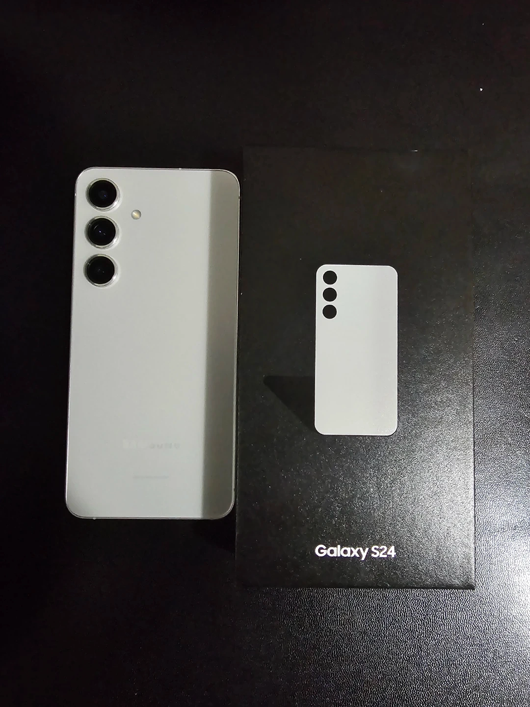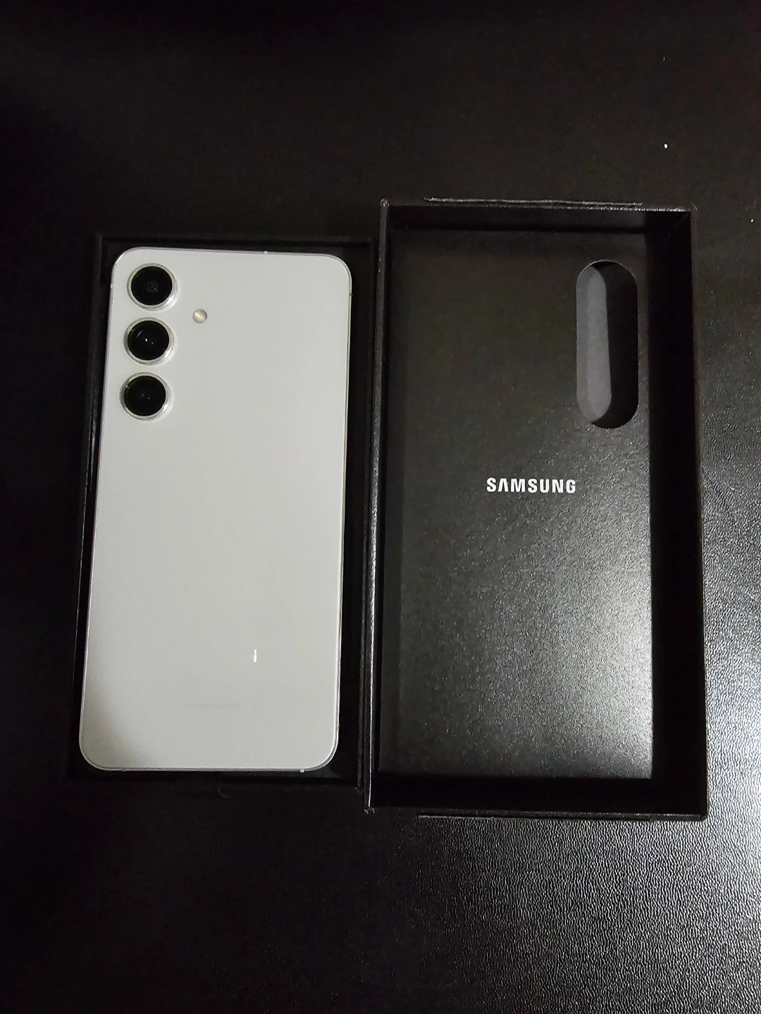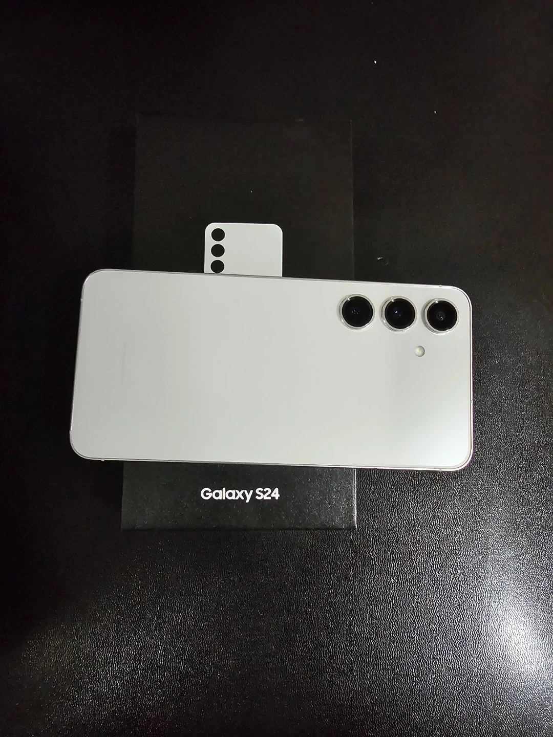 This is a Samsung Galaxy S24 smartphone in a light colour. It comes with its original box and packaging. It's a modern device with a triple camera setup.
