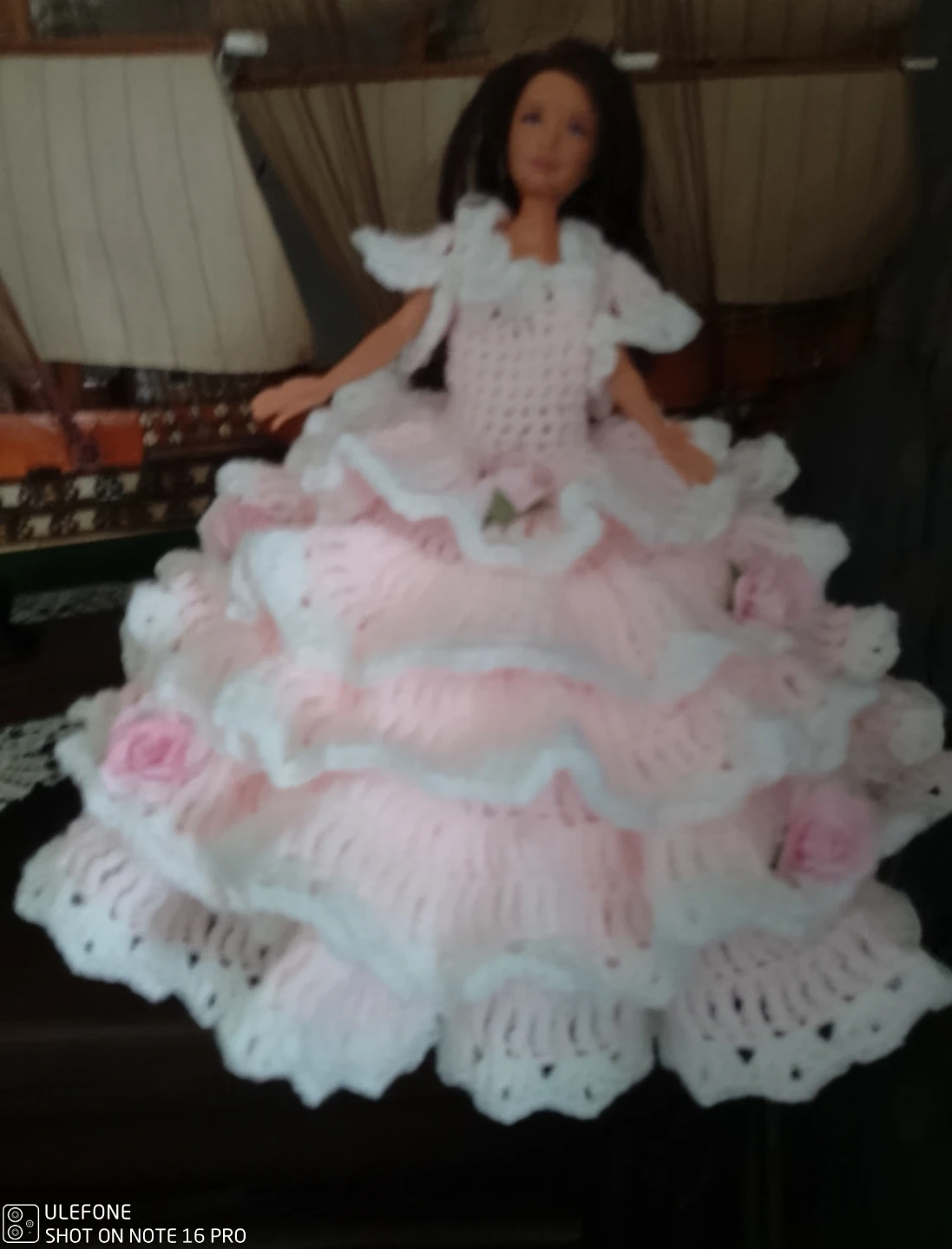 A lovely hand-knitted dress for a doll, featuring a pink bodice and a multi-layered skirt with white ruffled trim. Small fabric roses are attached as decorative accents. It's a beautiful piece for any doll collection!