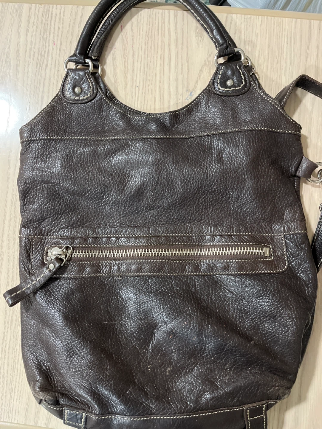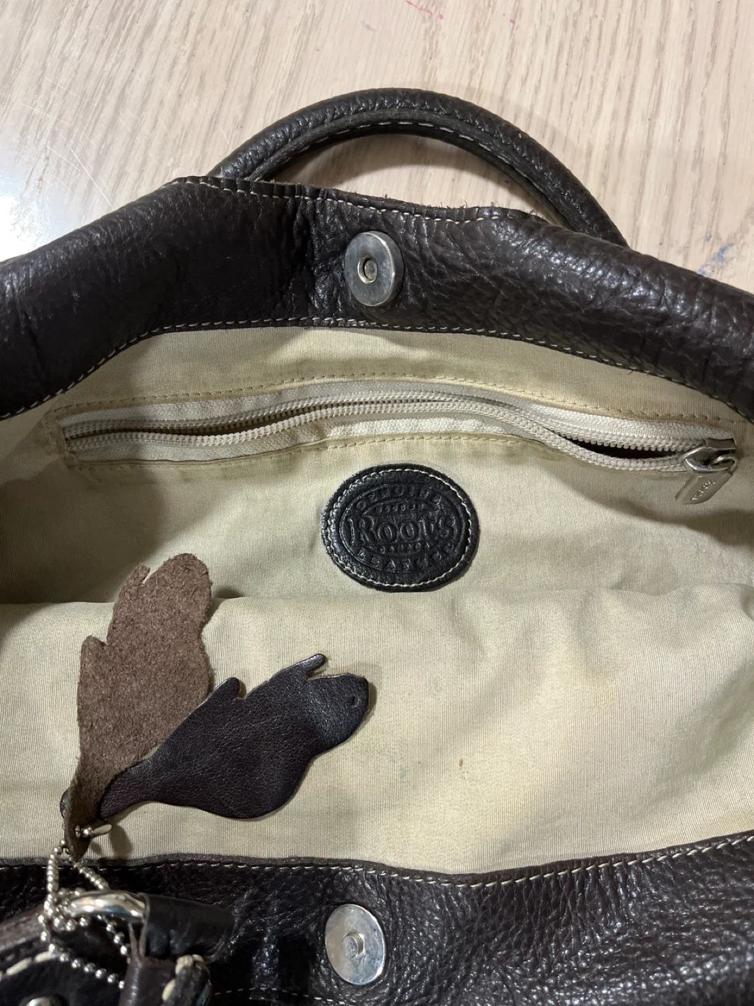 Dark brown pebbled leather shoulder bag by Roots. It features a top zipper closure and an exterior zippered pocket. Includes a detachable crossbody strap.