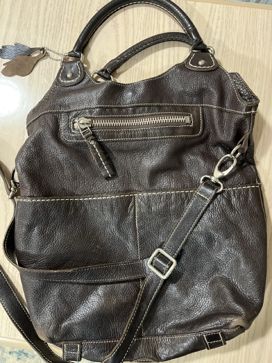 Dark brown pebbled leather shoulder bag by Roots. It features a top zipper closure and an exterior zippered pocket. Includes a detachable crossbody strap.
