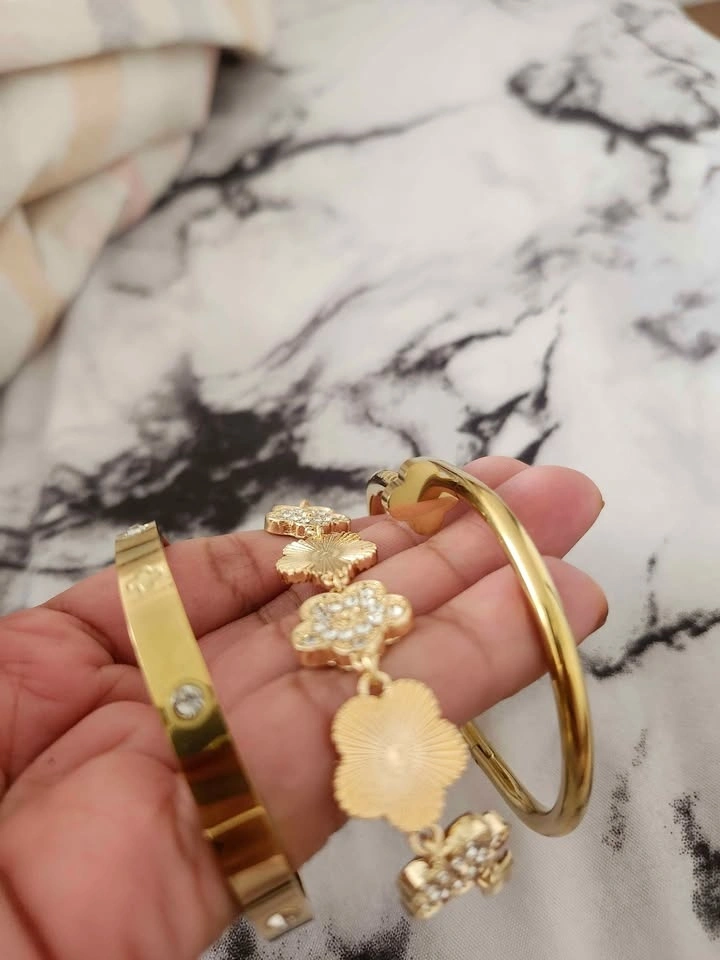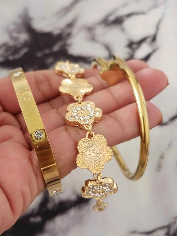 Stunning 3-piece gold-tone bracelet set featuring: Elegant clover charm bracelet with sparkling rhinestones, Classic gold bangle with crystal accents, Trendy nail-style cuff bracelet. Beautiful layered look when worn together or stylish on their own. Perfect for parties, weddings, Eid, gifts, or everyday glam. Condition: Brand New. Price: $20. Pickup: Brock Road & Pickering Parkway. Cash only. Smoke-free, pet-free home.