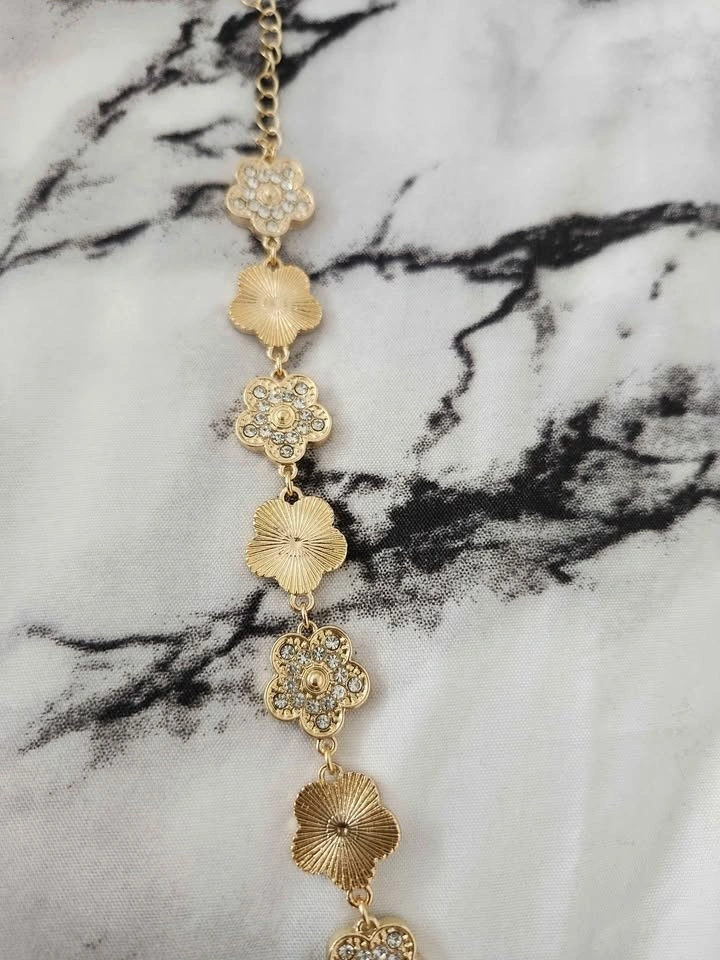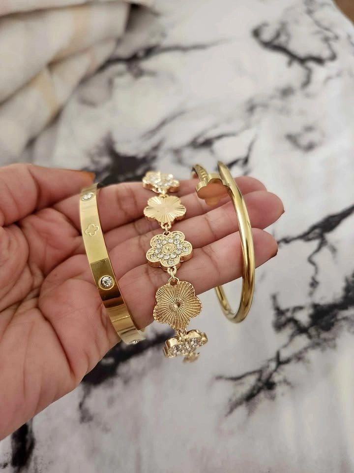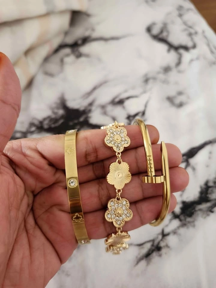 Stunning 3-piece gold-tone bracelet set featuring: Elegant clover charm bracelet with sparkling rhinestones, Classic gold bangle with crystal accents, Trendy nail-style cuff bracelet. Beautiful layered look when worn together or stylish on their own. Perfect for parties, weddings, Eid, gifts, or everyday glam. Condition: Brand New. Price: $20. Pickup: Brock Road & Pickering Parkway. Cash only. Smoke-free, pet-free home.