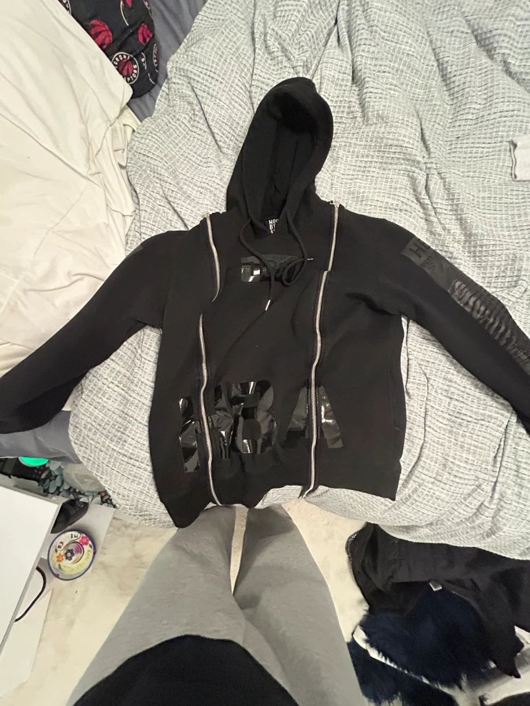 This black double zip-up hoodie features a unique graphic design on the front and a comfortable hood. It's made of a soft fabric blend. This hoodie is great for casual wear.