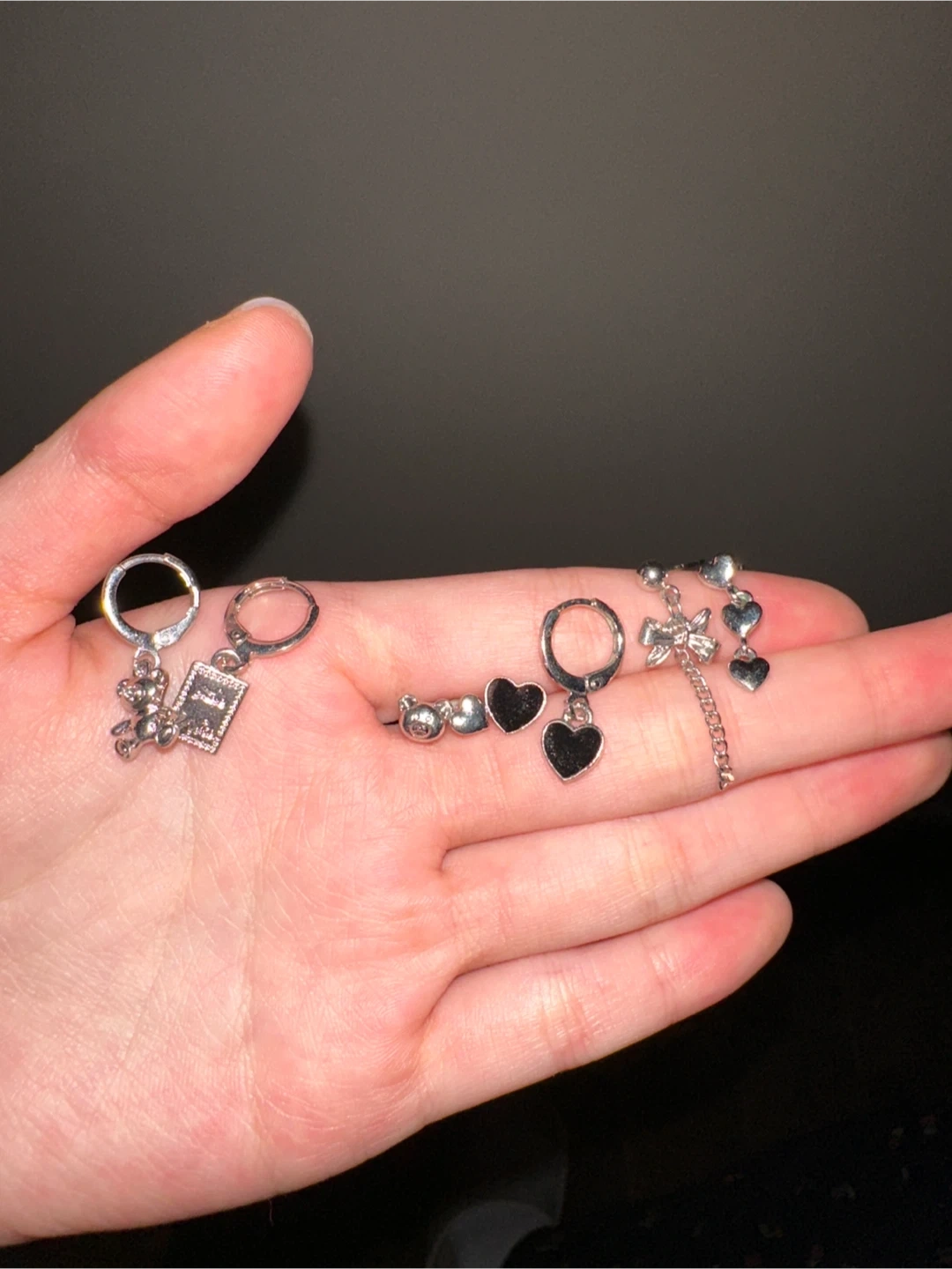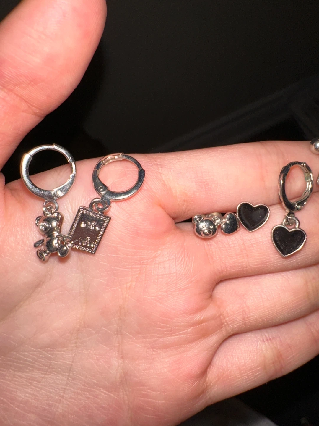 A collection of fun silver-tone earrings. Includes teddy bear, heart, and bow charms. Mix and match for different looks!