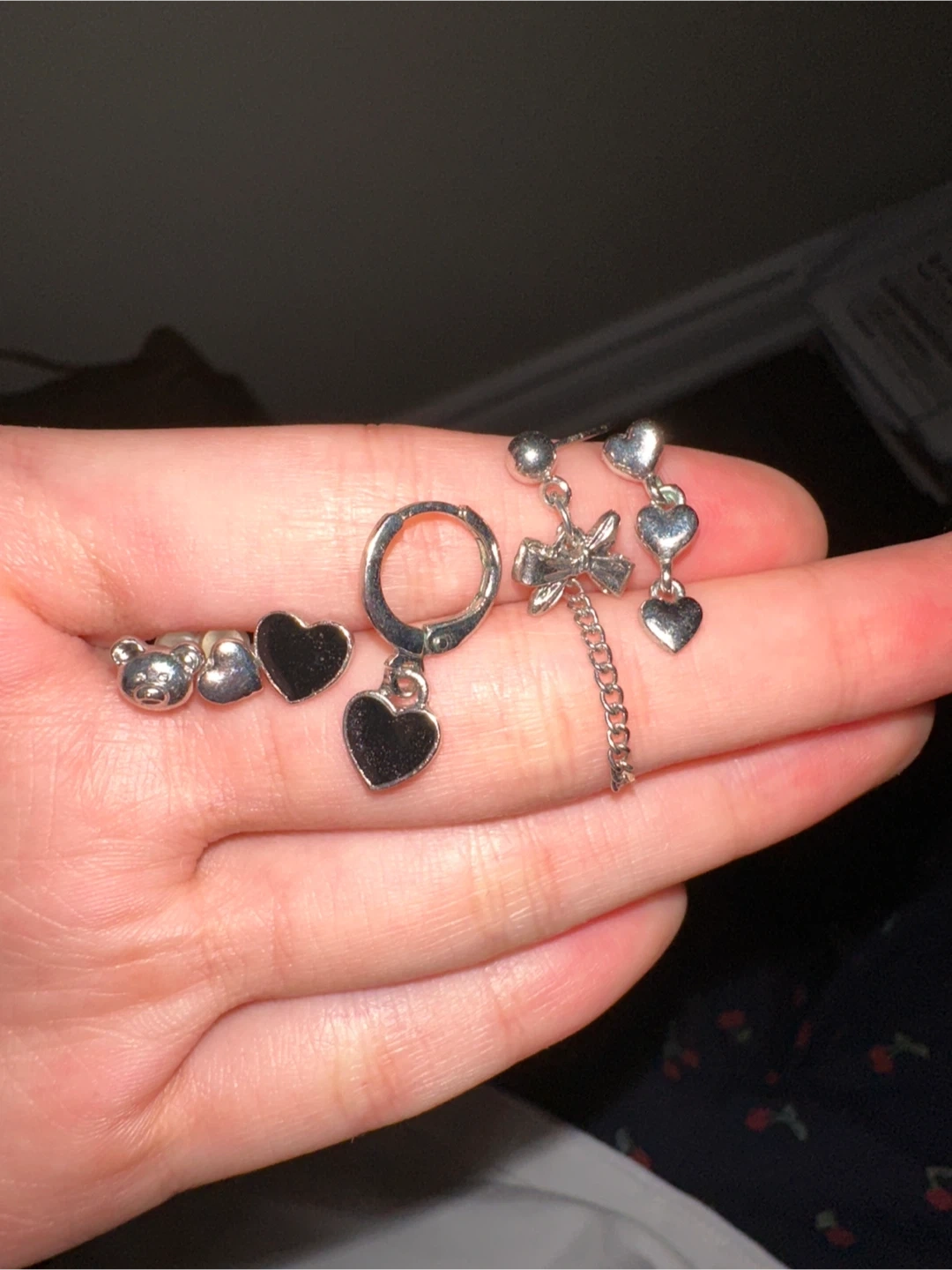 A collection of fun silver-tone earrings. Includes teddy bear, heart, and bow charms. Mix and match for different looks!
