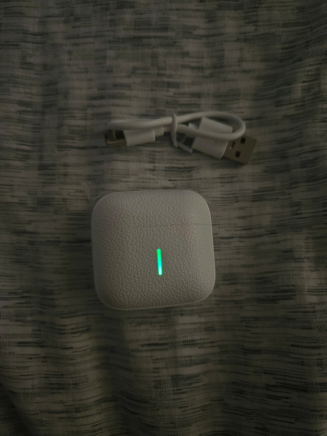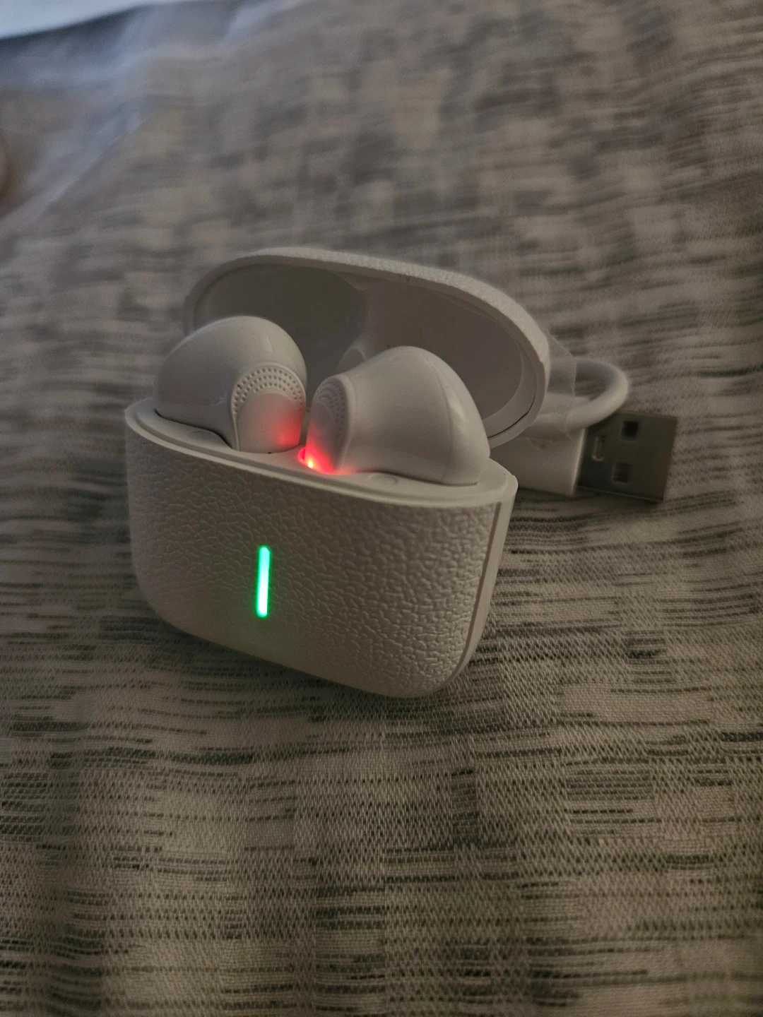 Selling a pair of white wireless earbuds. They come with their charging case and a USB cable. Perfect for listening to your favourite tunes on the go!