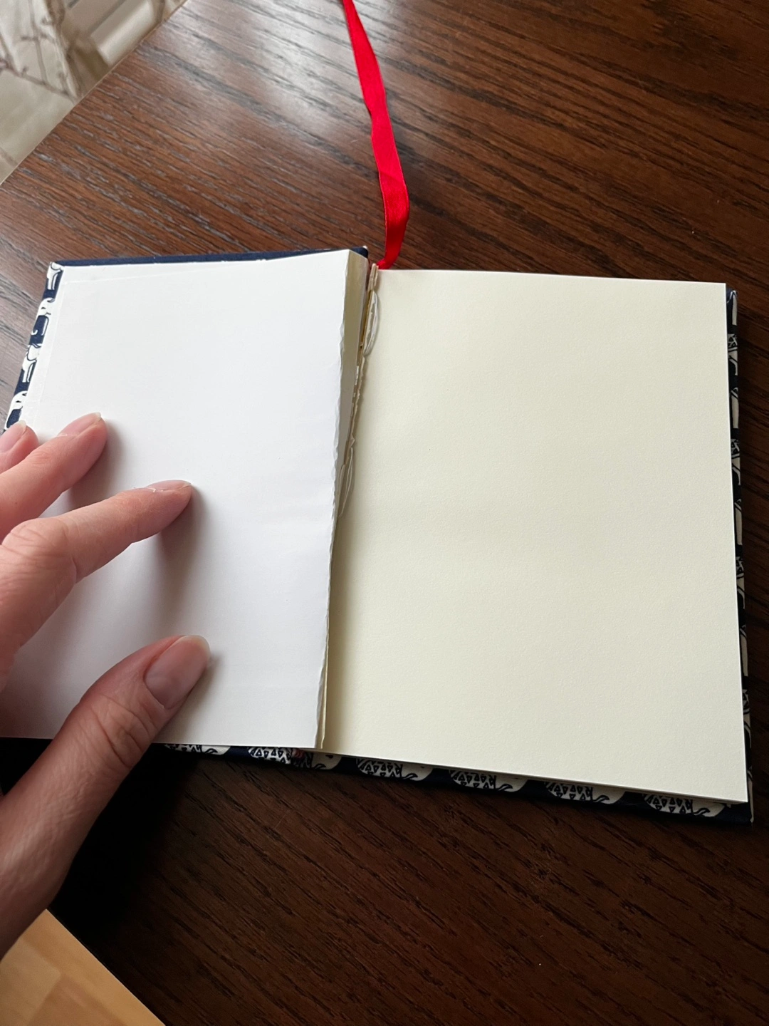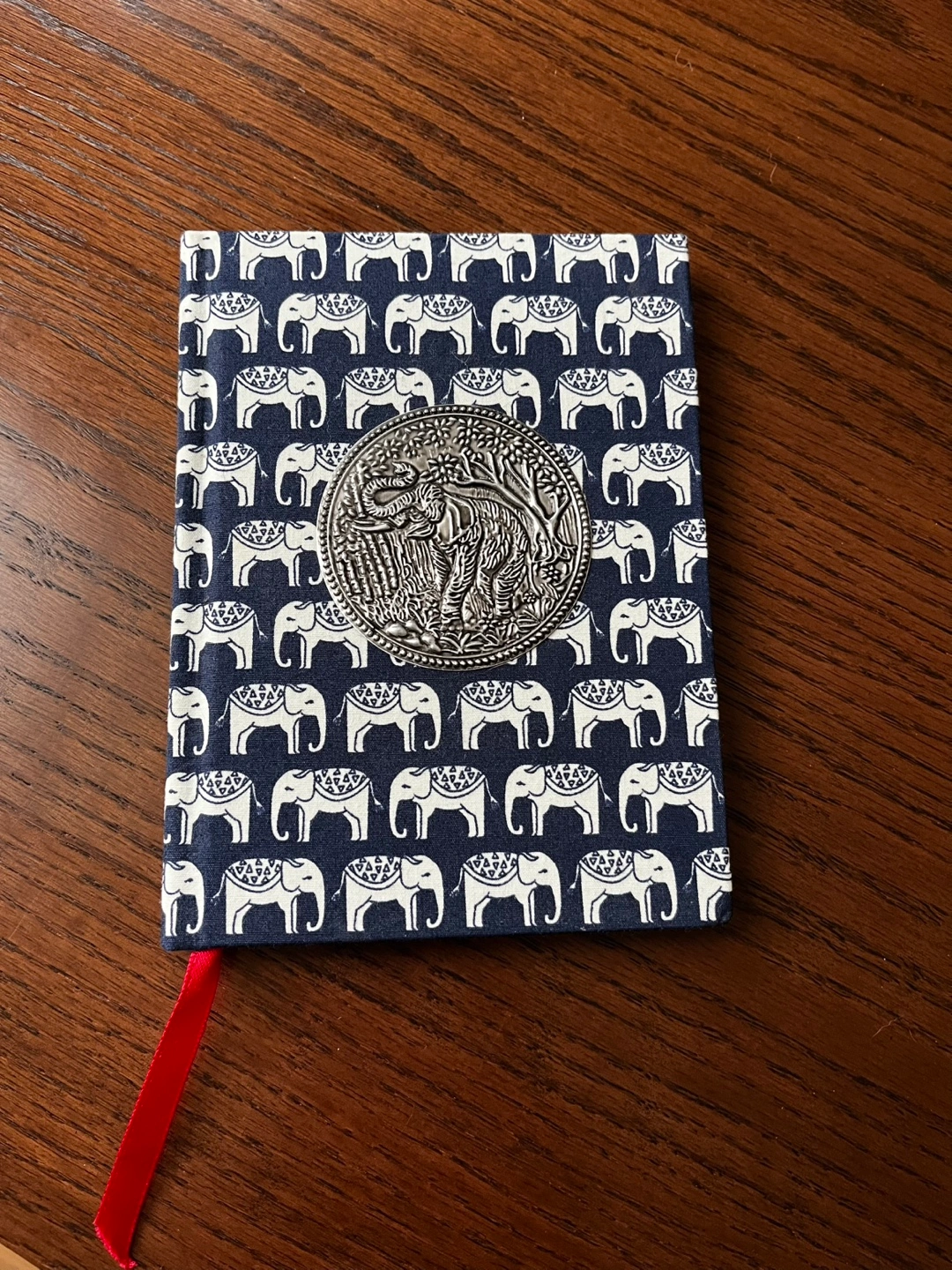Small notebook. Dark blue cover with white elephant print. Silver elephant medallion on the cover. Red ribbon bookmark. Blank pages inside. Some binding separation from personal pages being removed.