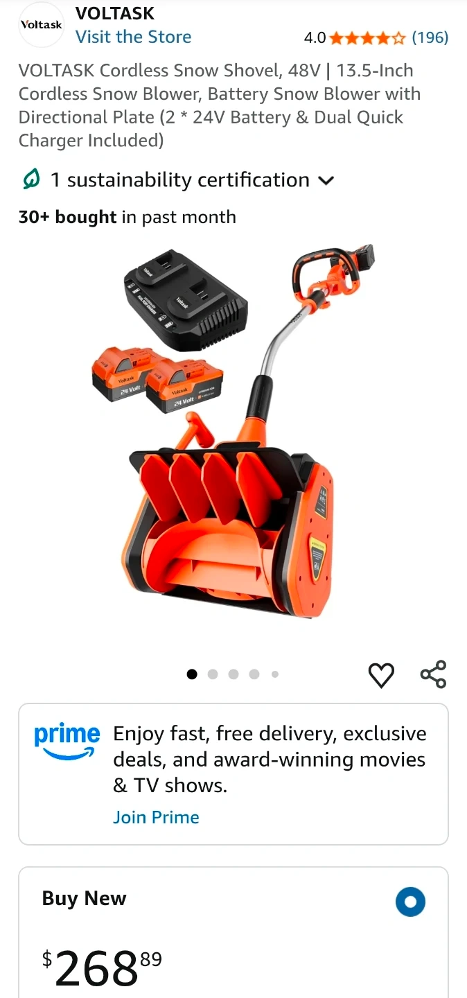 I'm selling a Voltask cordless snow shovel, 48V, with a 13.5-Inch cordless snow blower, and battery snow blower with directional plate and two 24V battery and dual quick charger included. This item is new, and ready to make snow removal a breeze!