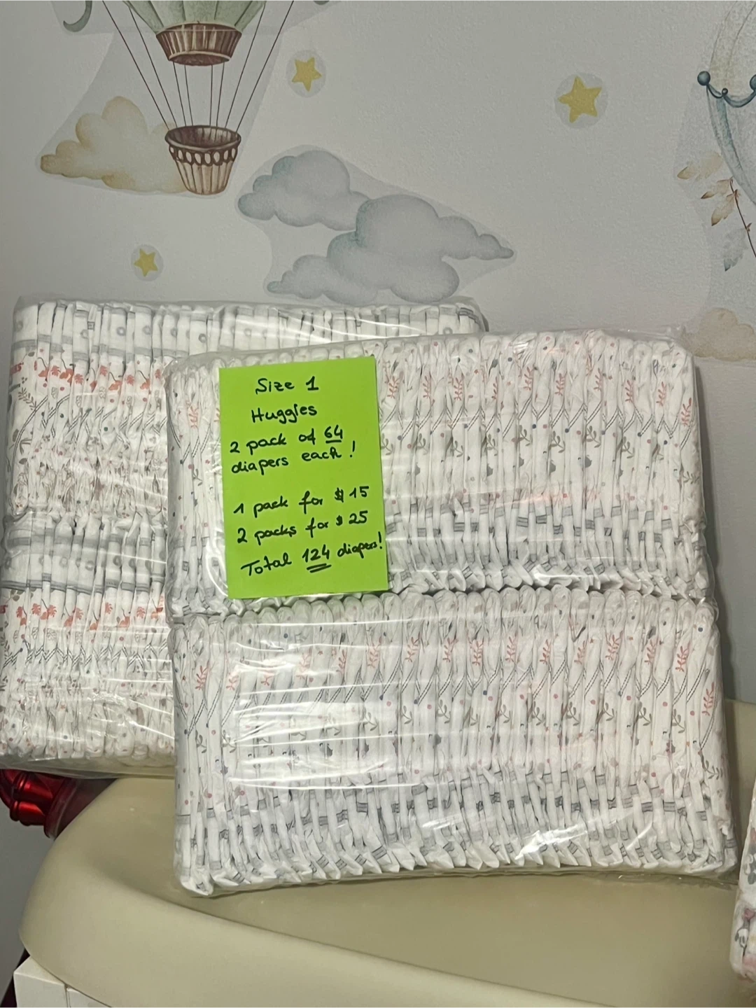 I have new packs of Huggies diapers in size 1. They are still sealed in their original packaging.