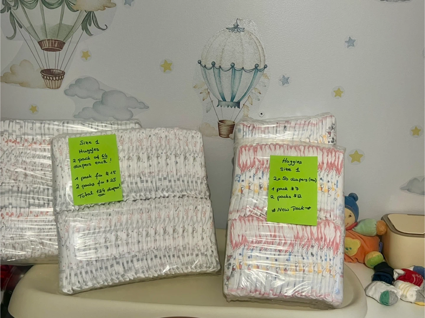 I have new packs of Huggies diapers in size 1. They are still sealed in their original packaging.