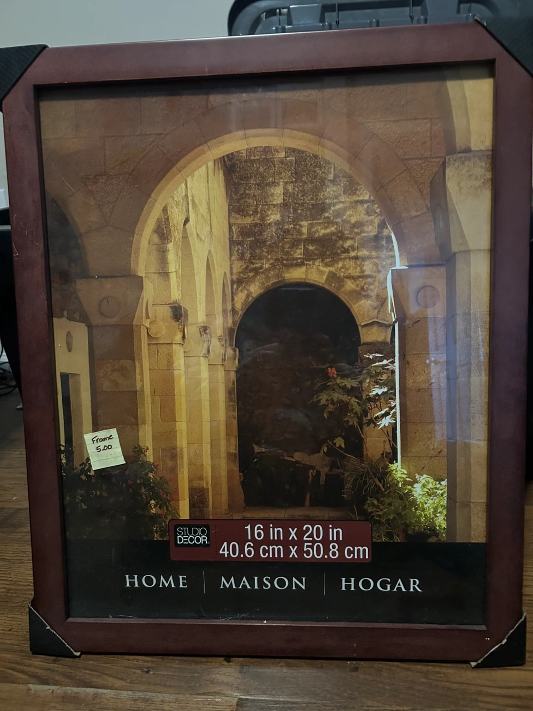 This is a Studio Decor photo frame. It measures 16 inches by 20 inches (40.6 cm x 50.8 cm). It's a dark wood colour. This frame is ready to display your favourite pictures!