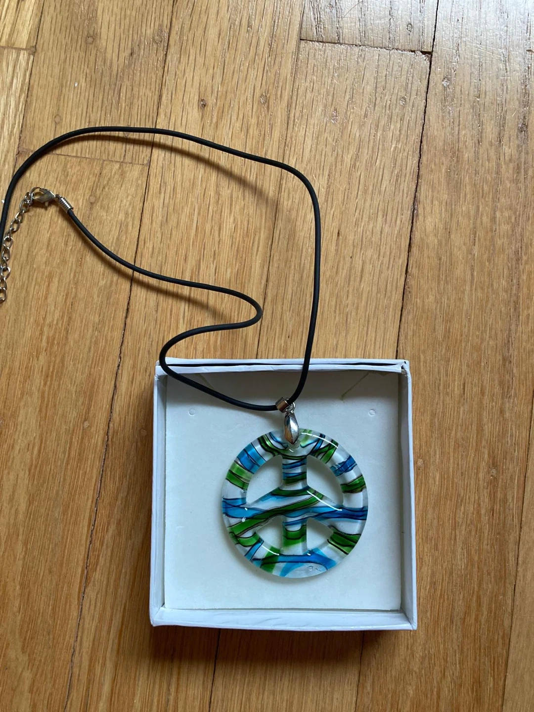 Colourful peace sign pendant necklace with a black cord. Features a vibrant swirl of blues, greens, and white glass. The cord has a silver-toned clasp and an adjustable chain.