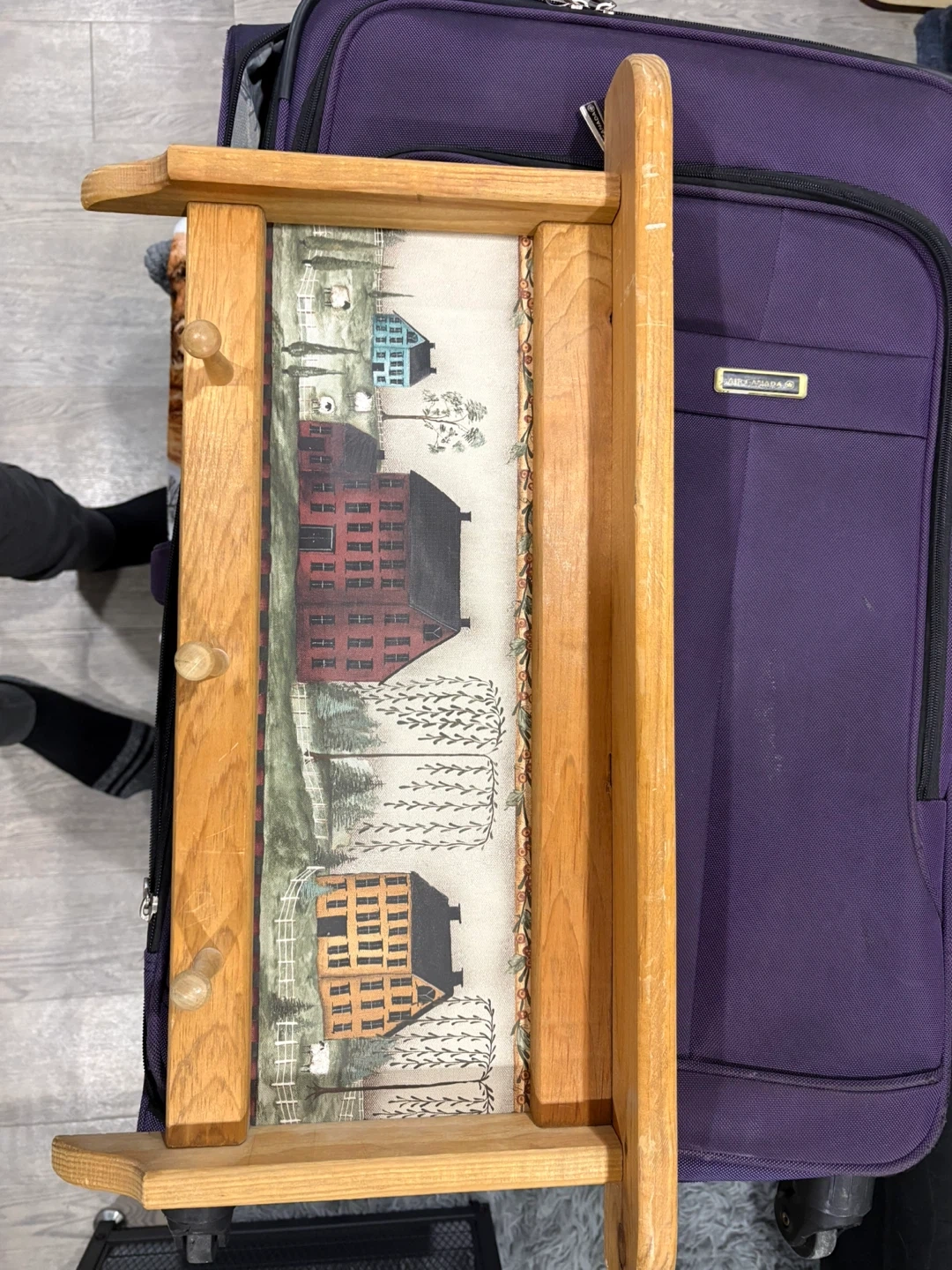 Wooden wall organizer featuring a charming folk art print of rural houses and trees. It has three pegs for hanging items. This would be handy for organizing keys or small accessories by the entryway.
