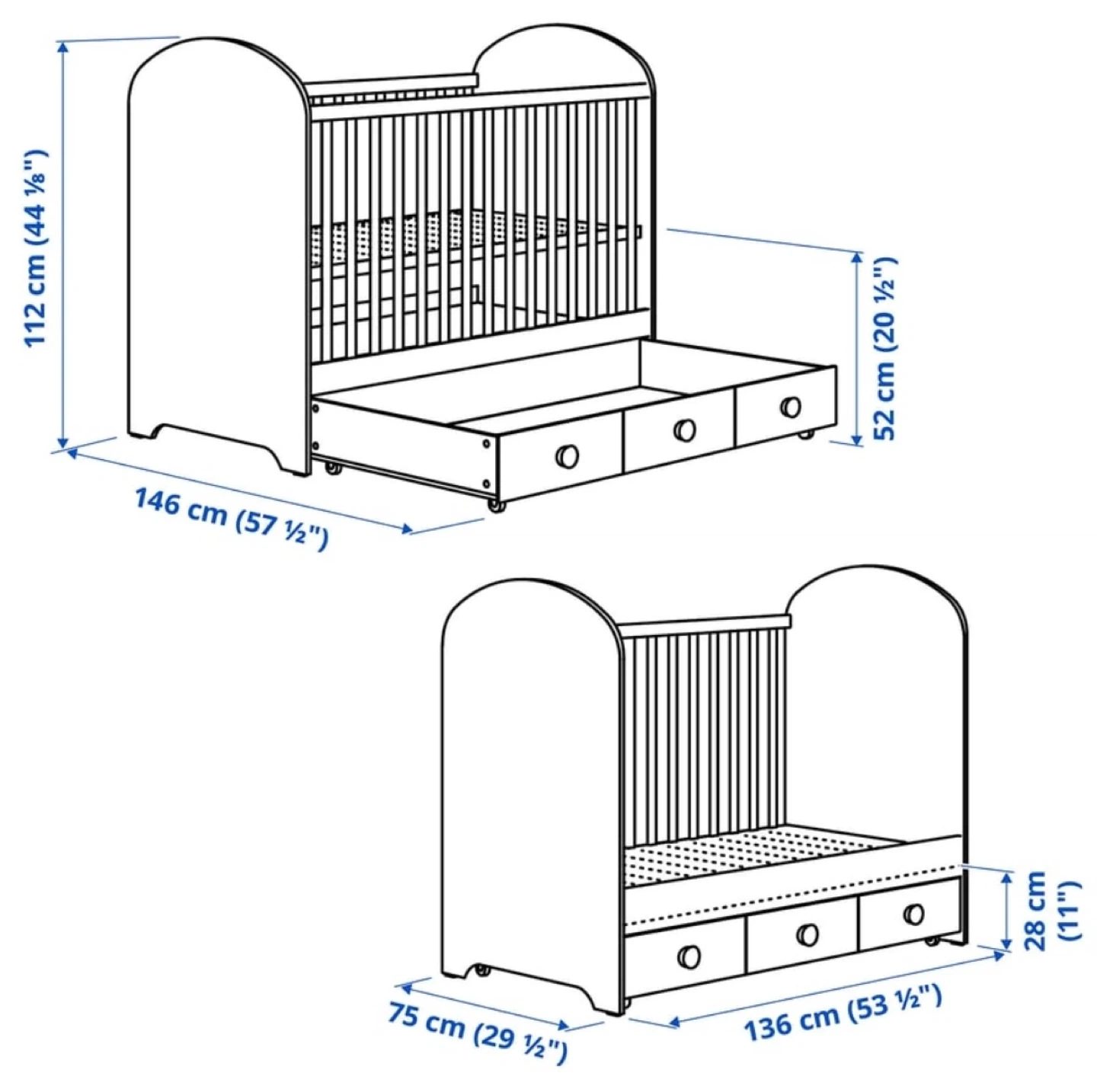 A white baby crib with a built-in drawer for storage. It's made of wood. This crib is 146 cm long and 57.5 inches wide. It's suitable for newborns and young children.