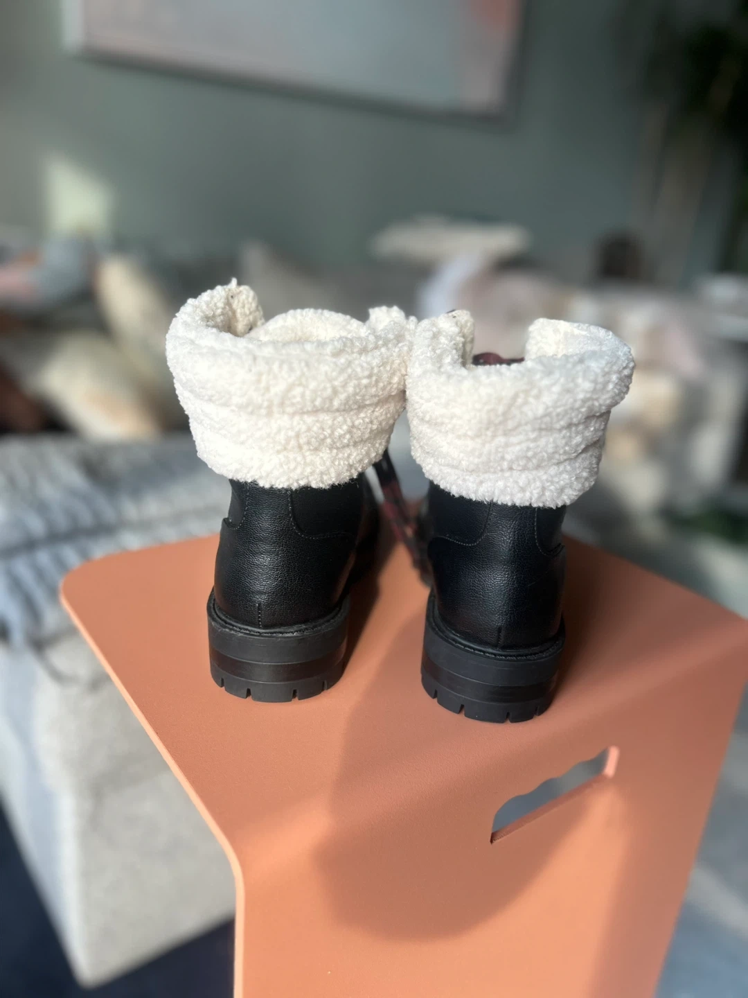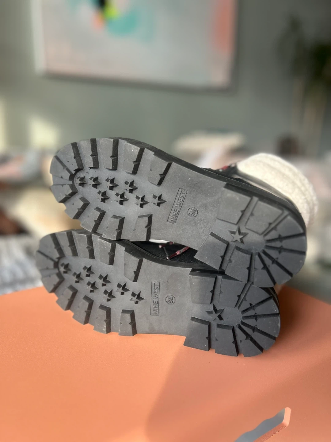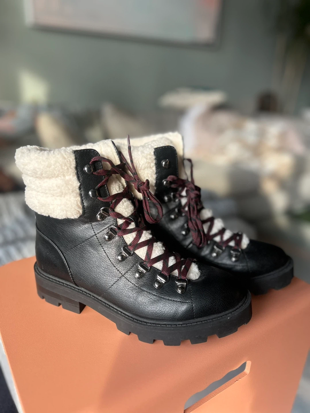 These Nine West winter boots are black with cozy sherpa lining. They feature a durable lug sole for traction and a lace-up closure. Perfect for staying warm and stylish during colder months!