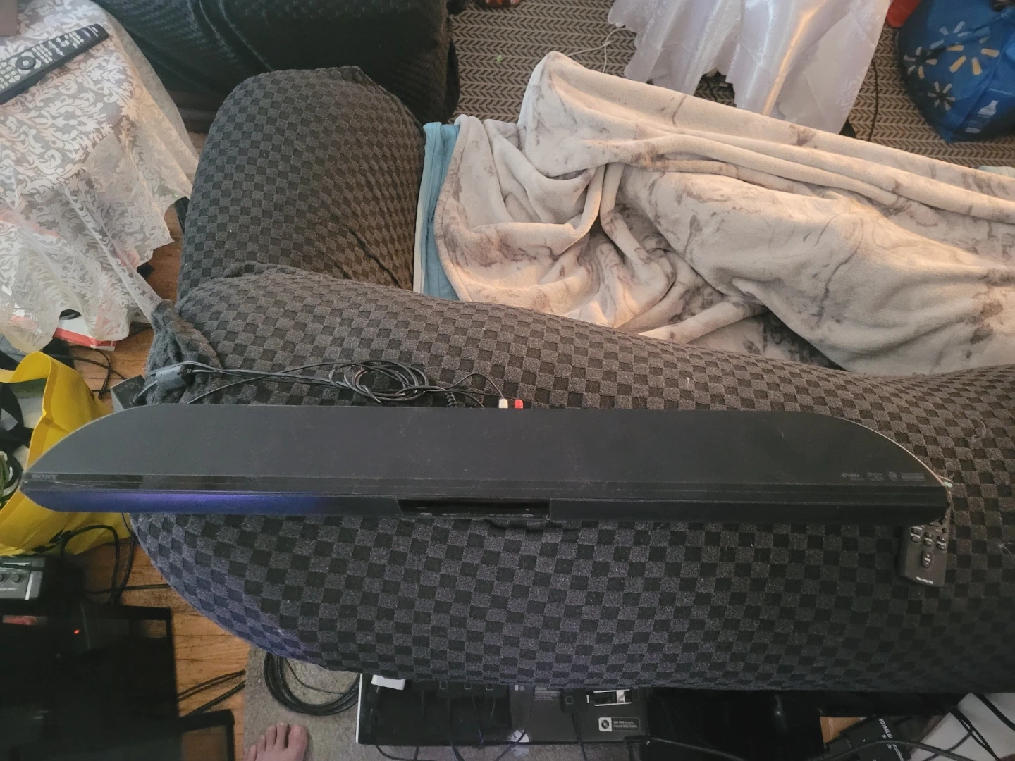 Ps3 Rare subwoofer with optical cable and aftermarket remote control. Don't use it clearing out closet