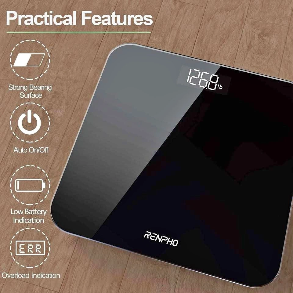 Accurately achieve accurate and trustworthy measurements using our high-quality bathroom scale. With 4 high-precision sensors, this body weight scale proudly guarantees high accuracy at 0.1lb/0.05kg increment and supports a maximum weight capacity of 400 lbs/180kg. Features a large rounded corner design, LED display, and is black. Dimensions: 11.02″ x 11.02″ x 0.87″.