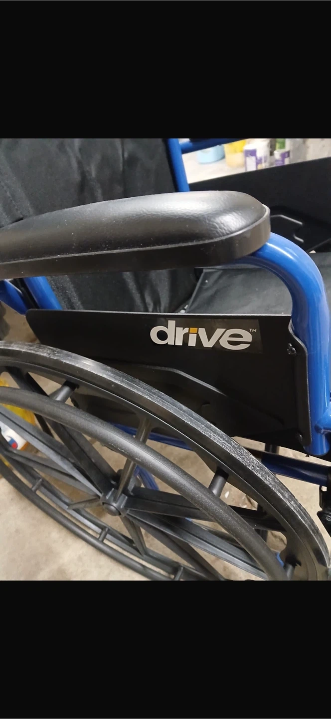 This is a Drive Medical transport wheelchair in blue. It features sturdy armrests and a durable frame for reliable use. The large rear wheels ensure smooth mobility. It's a practical choice for easy transport.