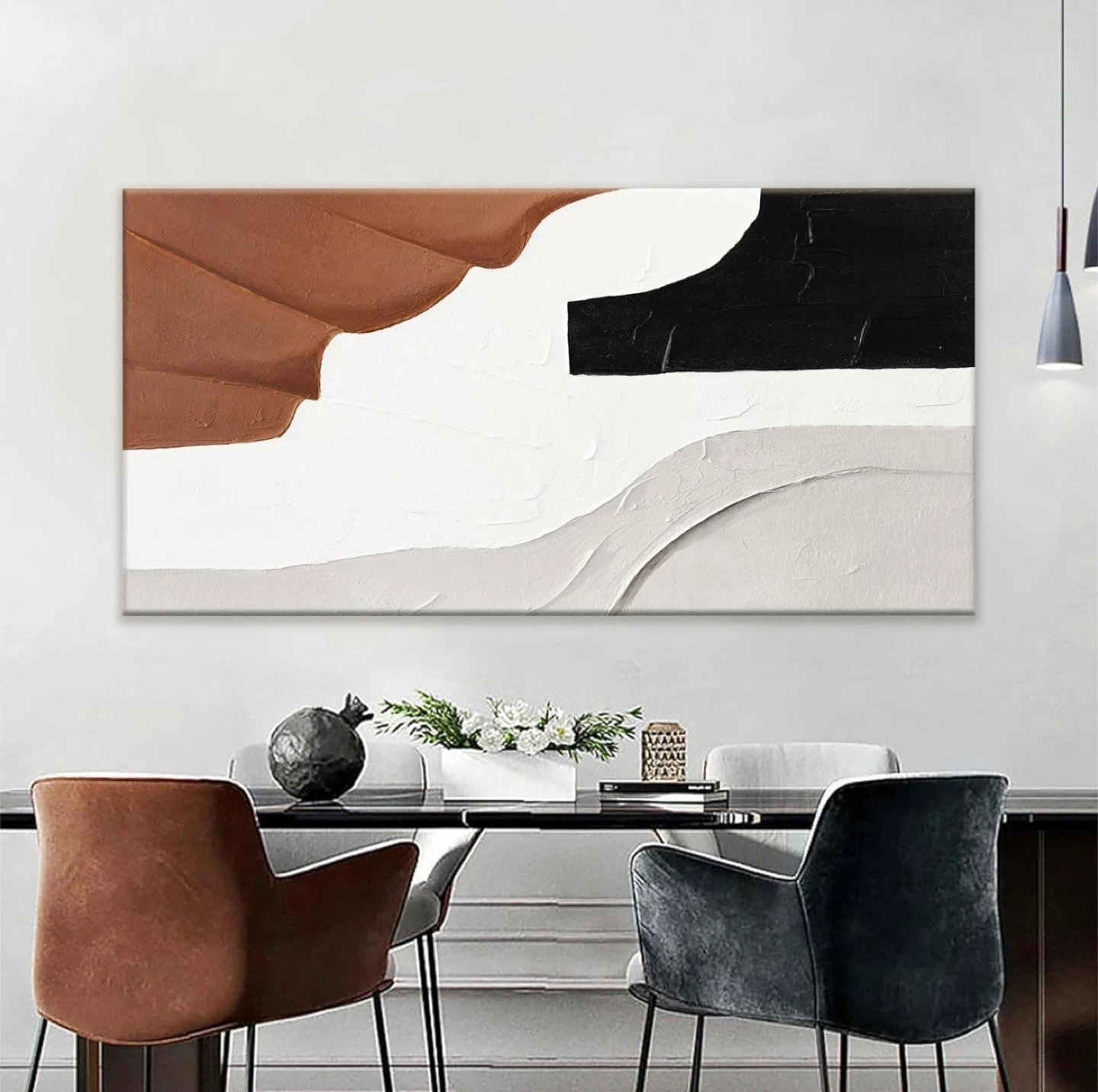 This large canvas art features a textured abstract design with earthy brown, bold black, and clean white tones. It's a modern piece that adds depth and style to any room. The painting's tactile surface provides a unique visual and dimensional appeal.