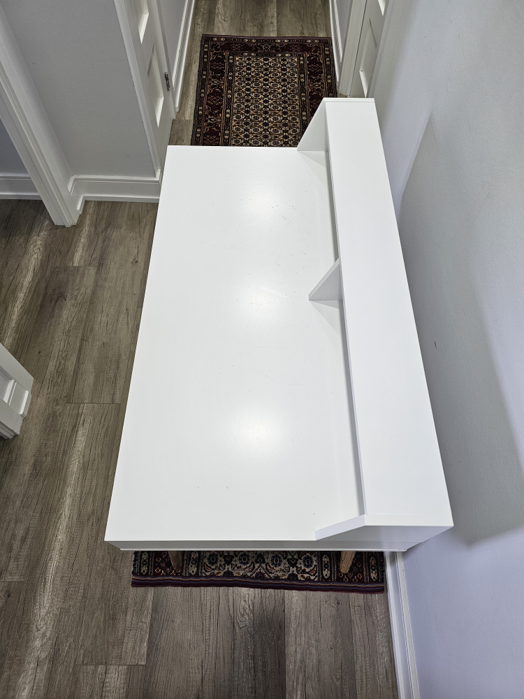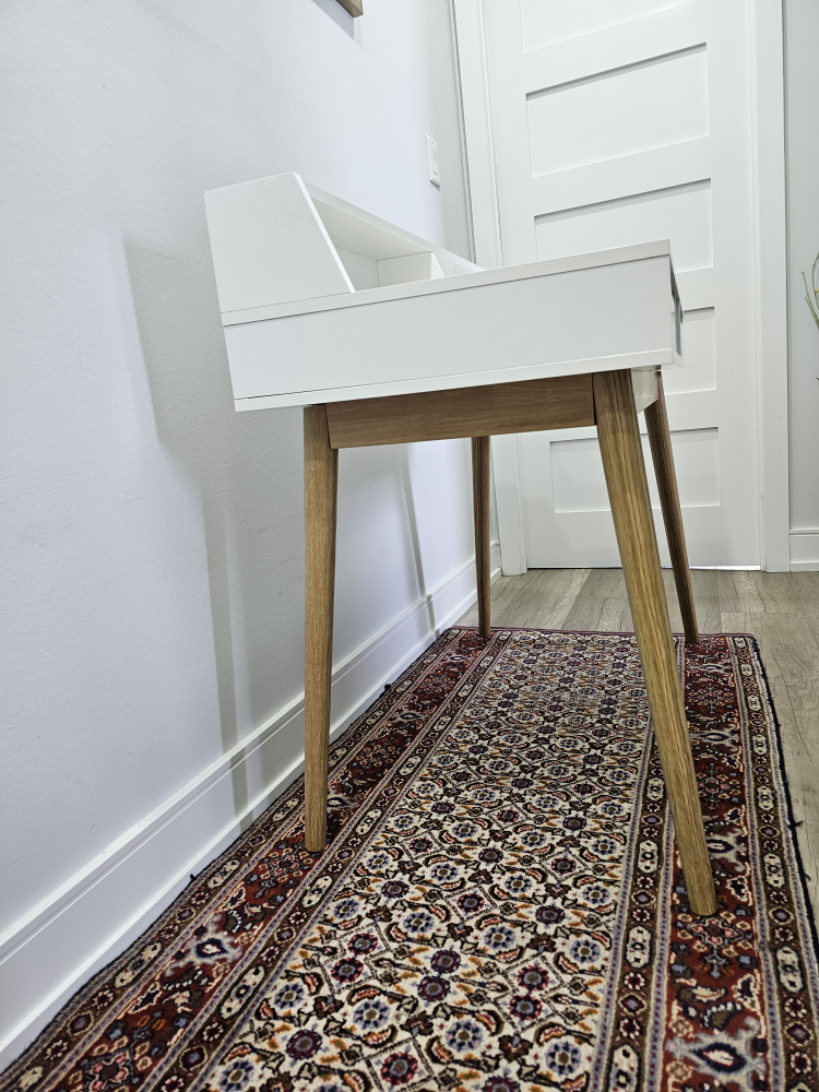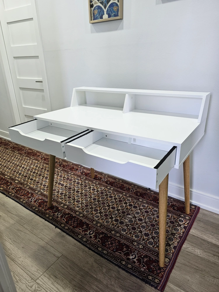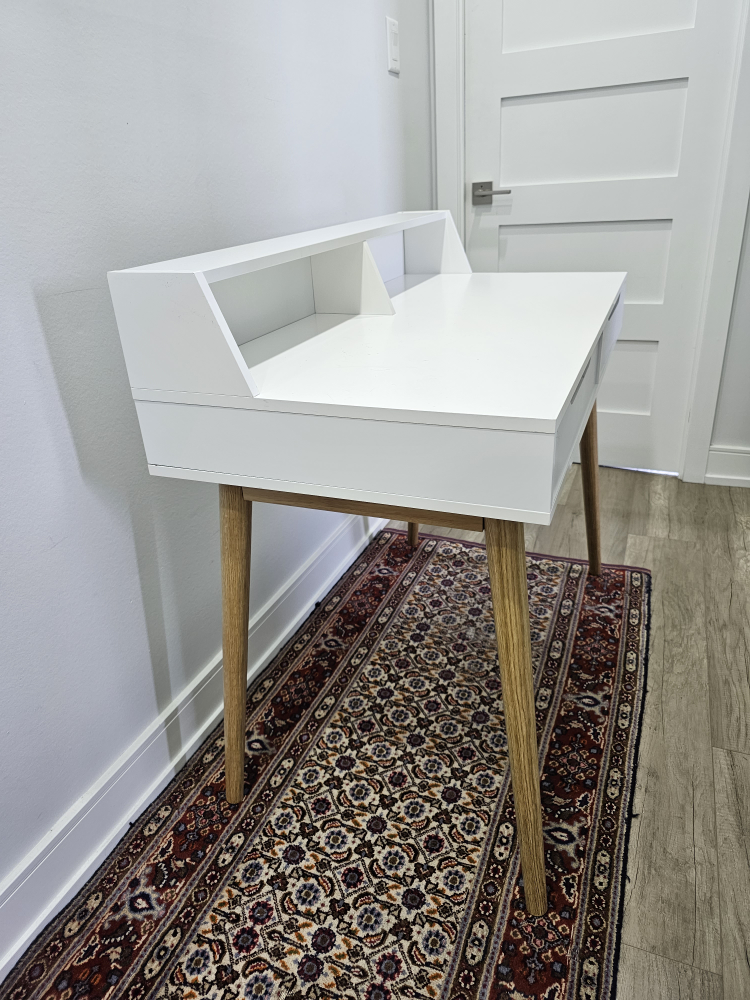 Functional desk, handy drawers, hideaway shelves, modern look, and a light footprint.