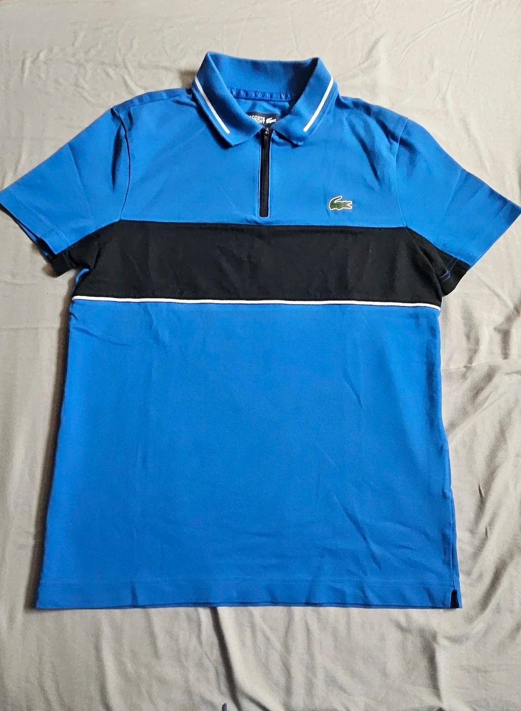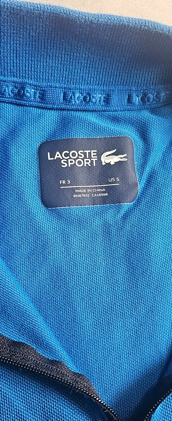A blue and black Lacoste Sport polo shirt. It's a size US S and made in China. This short-sleeve polo has a quarter-zip closure. It's made from a breathable fabric.