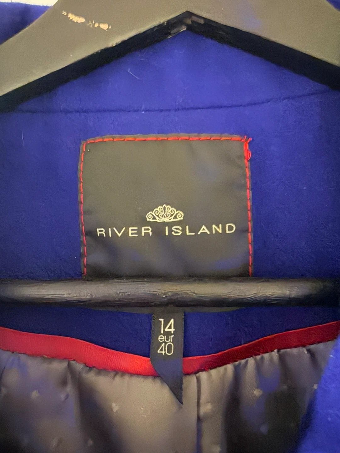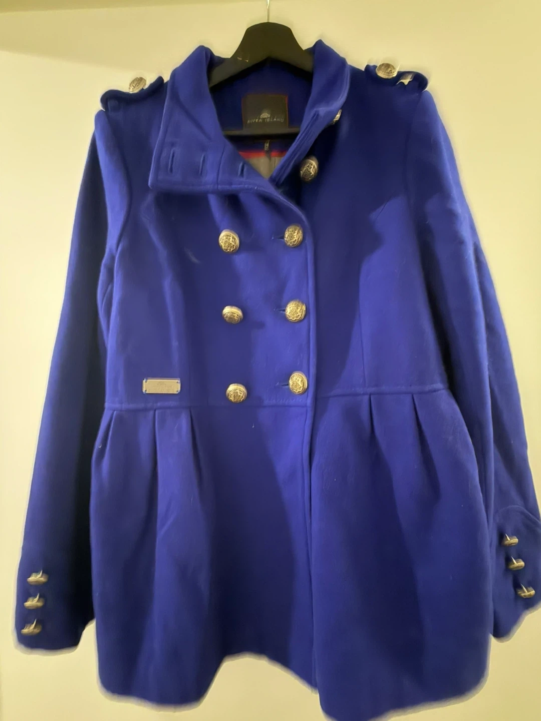 This is a River Island blue coat. It features a double-breasted design with gold-tone military-style buttons. Size is 14 UK / 40 EUR. It's a stylish outerwear piece for cooler weather!