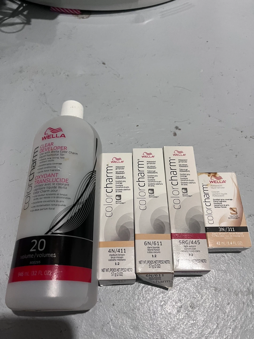This kit includes a Wella Color Charm Clear Developer, 20 volume, in a 946 mL bottle. It also comes with three shades of Wella Color Charm permanent haircolor: 4N/411 medium brown, 6N/611 dark blonde, and 5RG/445 light auburn, each in 57 g boxes. A 3N/311 dark brown liquid haircolor in a 42 mL bottle is also included.