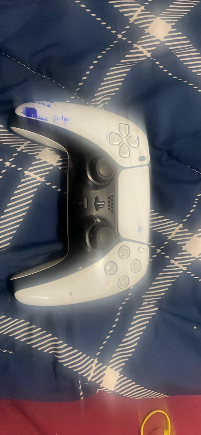 White PlayStation 5 DualSense wireless controller. Some scuff marks are visible on the white casing. It's a great controller for gaming!