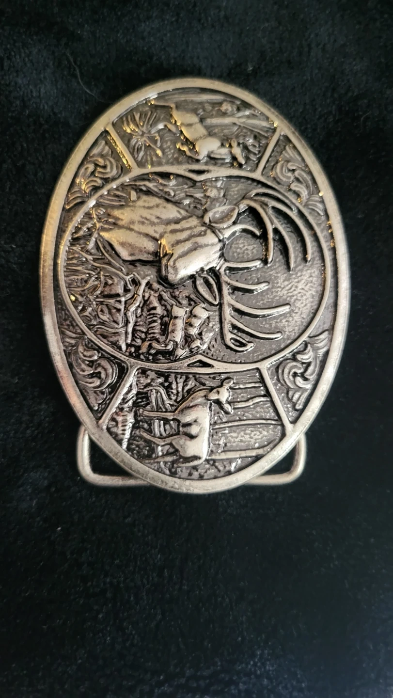 This oval buckle features a detailed embossed scene of deer and moose in a wilderness setting. It's made of a silver-toned metal. A great accessory for anyone who loves wildlife.