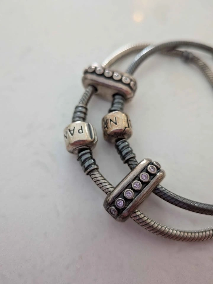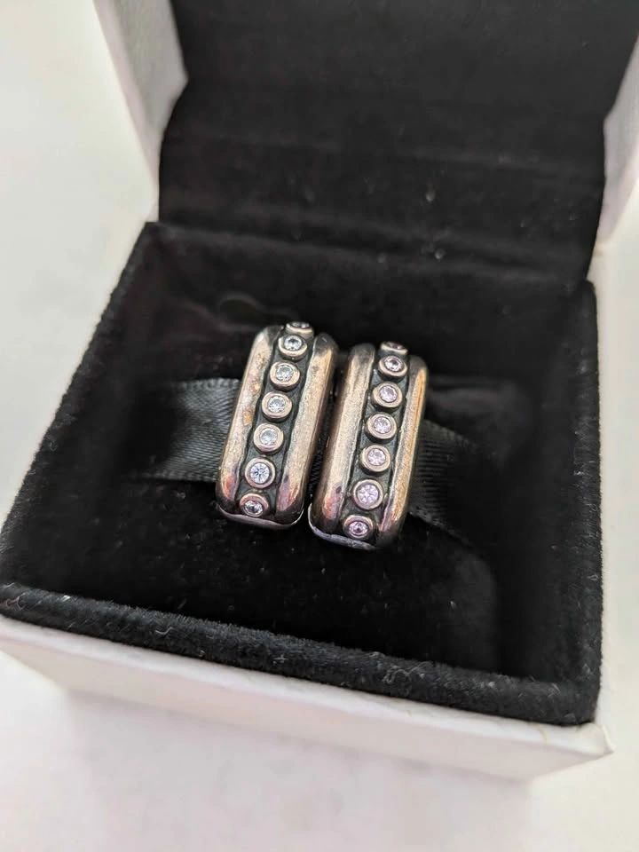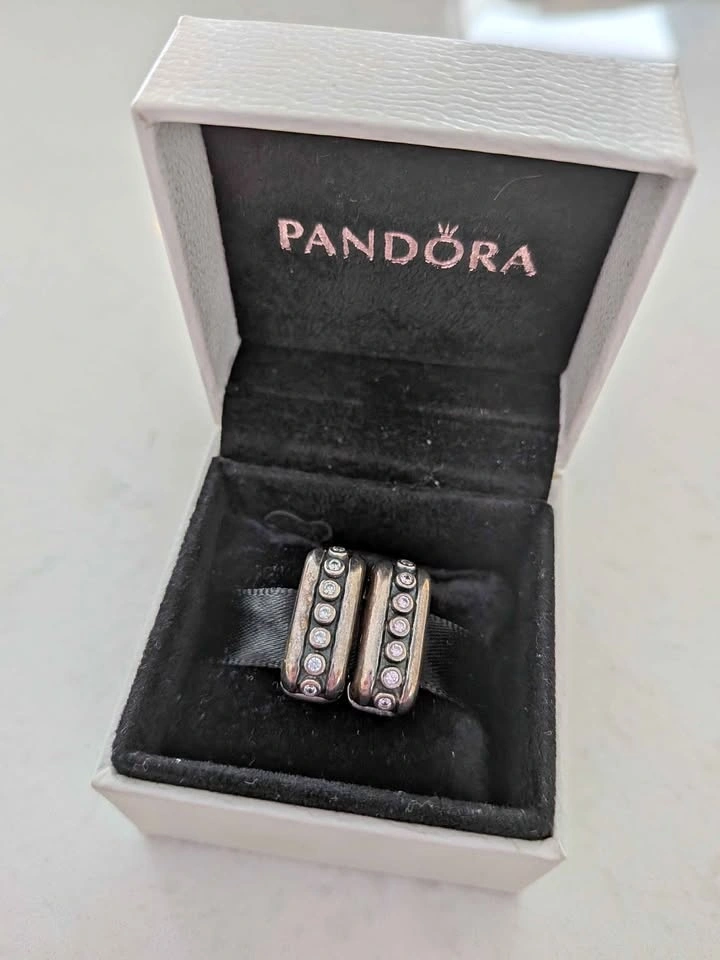 Pandora Sterling silver double diva clip with grey nano crystals. Used to attach two Pandora bracelets together. Pandora charm box not included. $35 for the pair. EUC. Pick up near Port Union and 401. Cross-posted. Fastest pickup please!