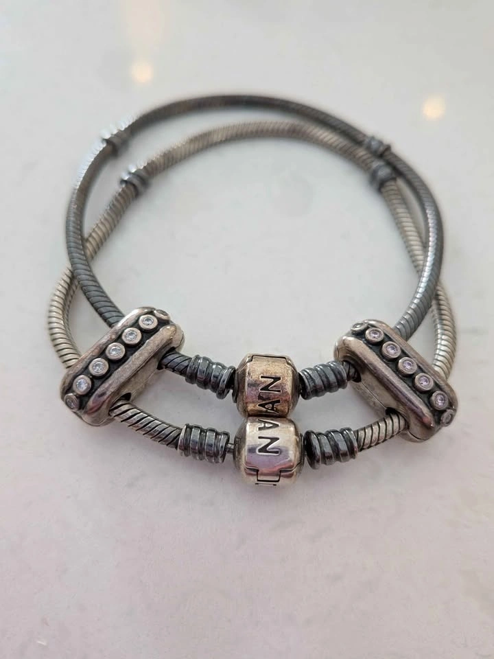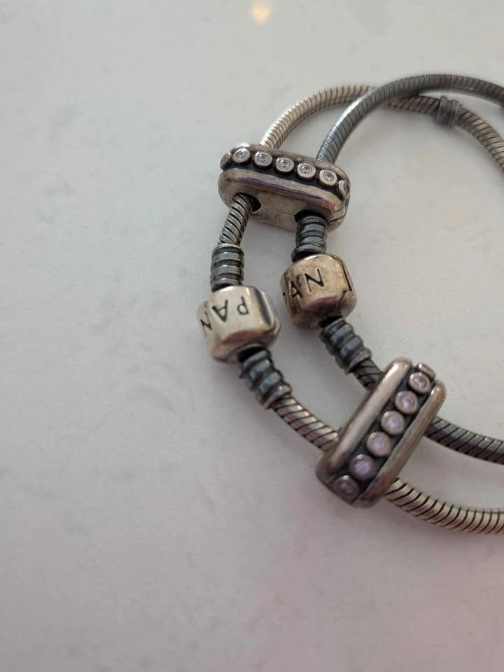 Pandora Sterling silver double diva clip with grey nano crystals. Used to attach two Pandora bracelets together. Pandora charm box not included. $35 for the pair. EUC. Pick up near Port Union and 401. Cross-posted. Fastest pickup please!