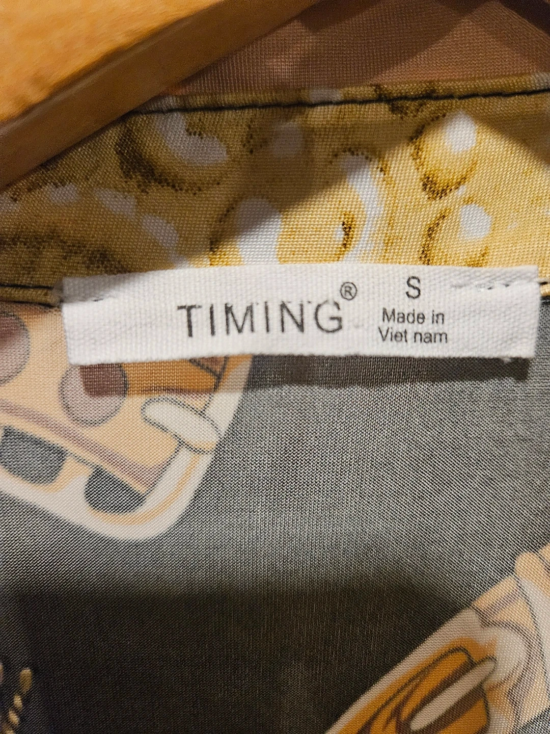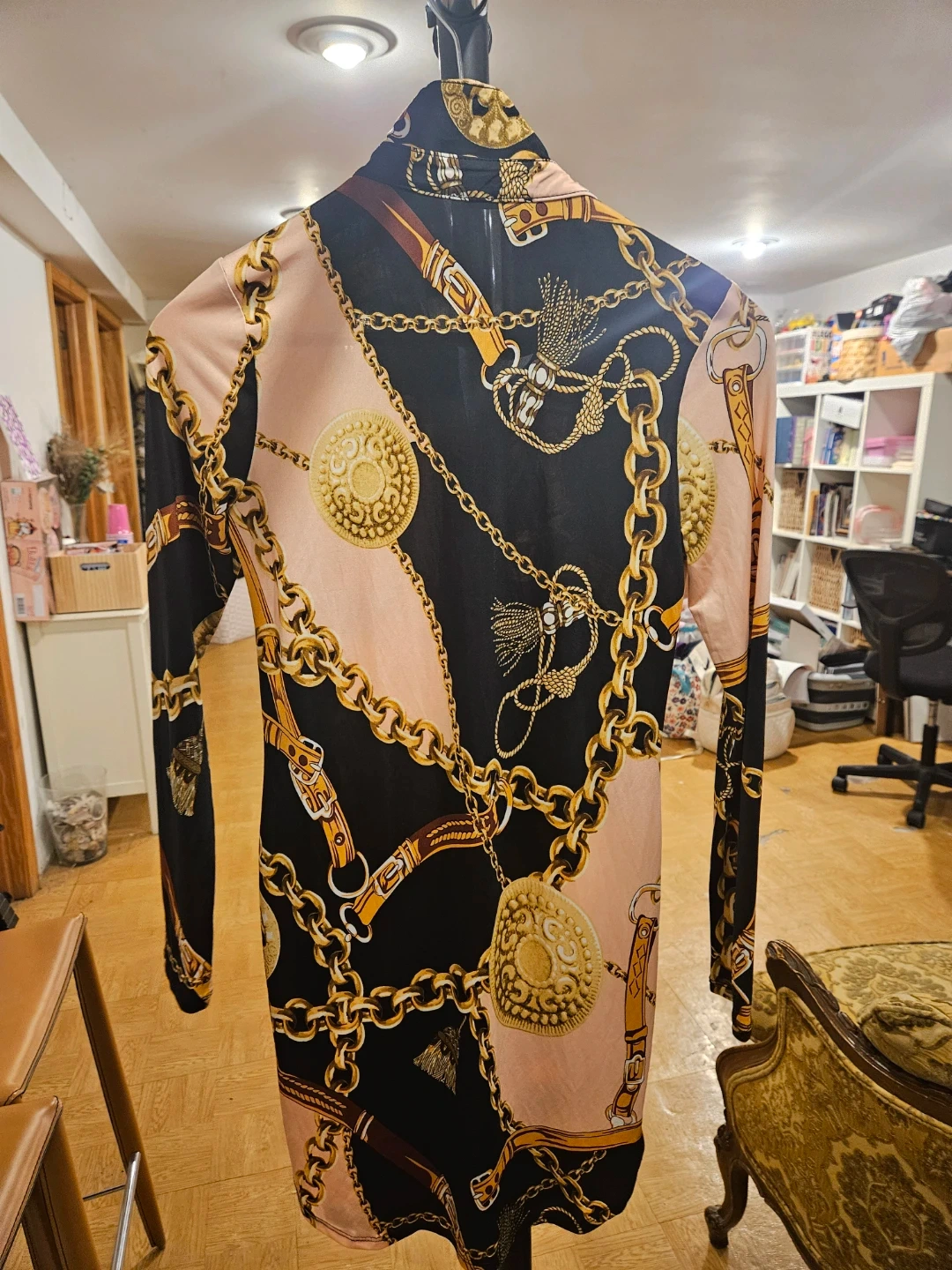 TIMING shirt dress with a bold chain and buckle print. Made from 94% polyester and 6% spandex. Size S, made in Vietnam. Button-up front and collared neckline.