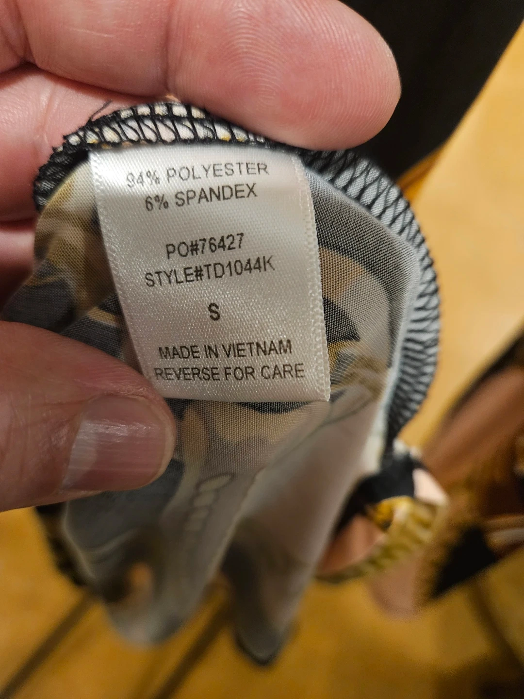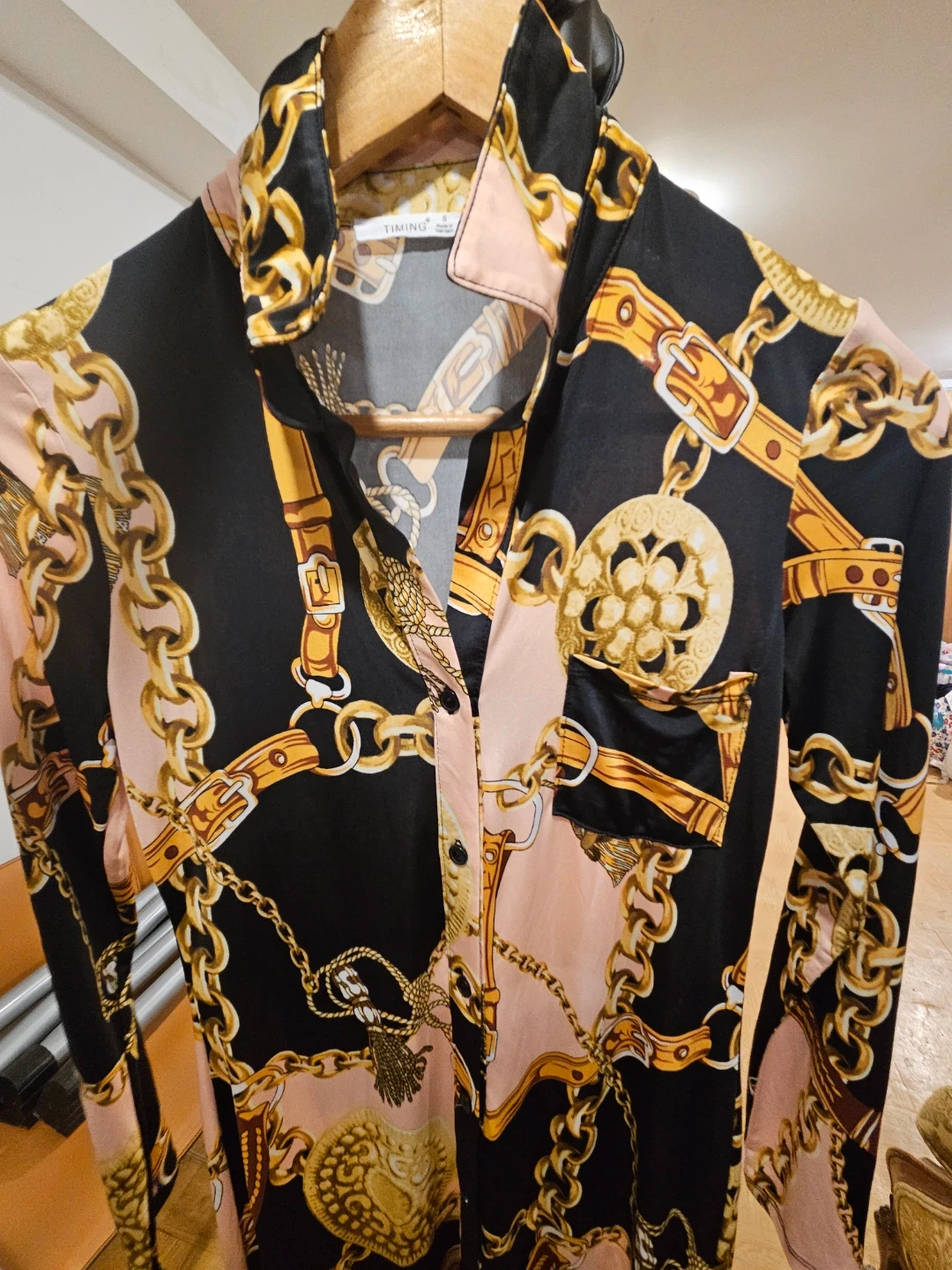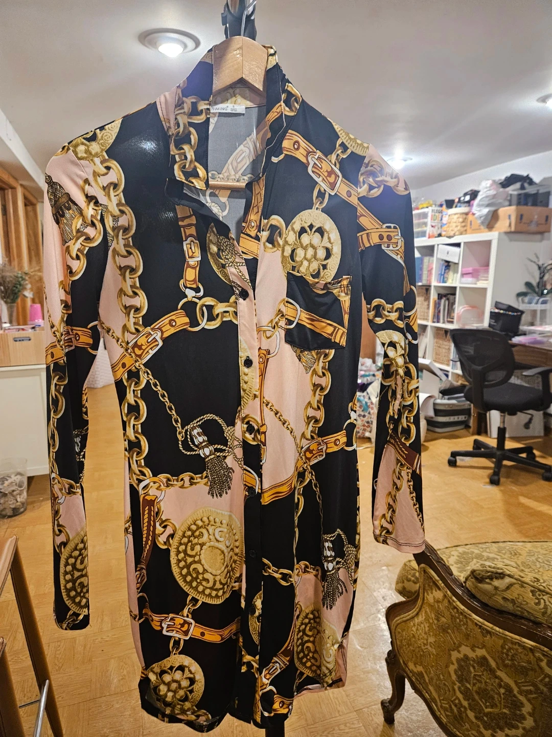 TIMING shirt dress with a bold chain and buckle print. Made from 94% polyester and 6% spandex. Size S, made in Vietnam. Button-up front and collared neckline.