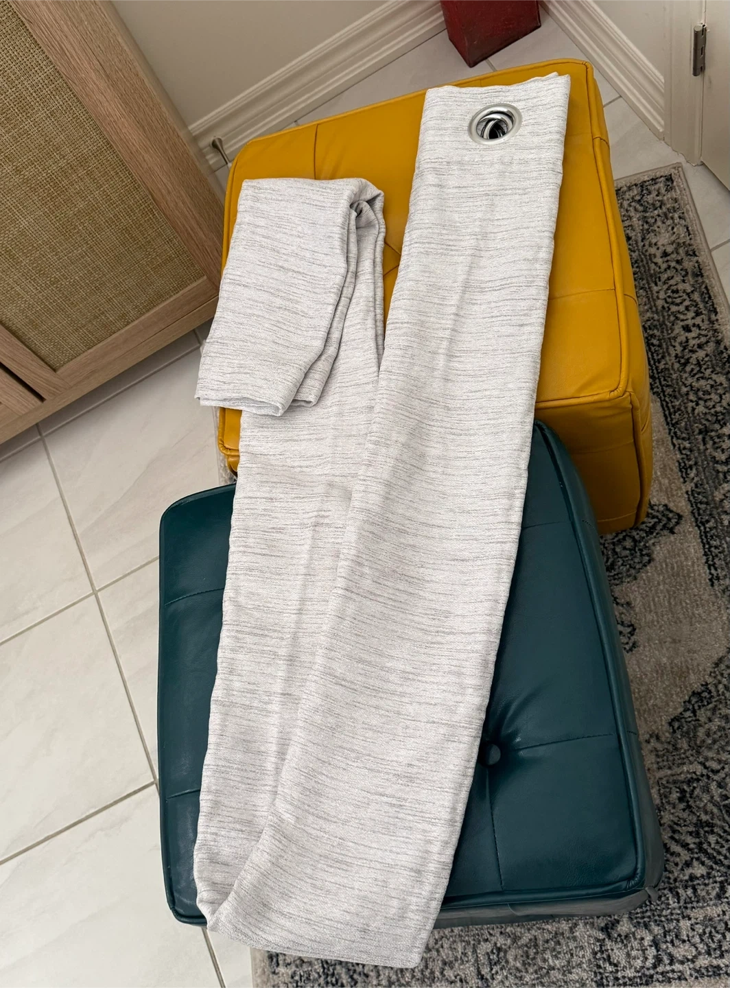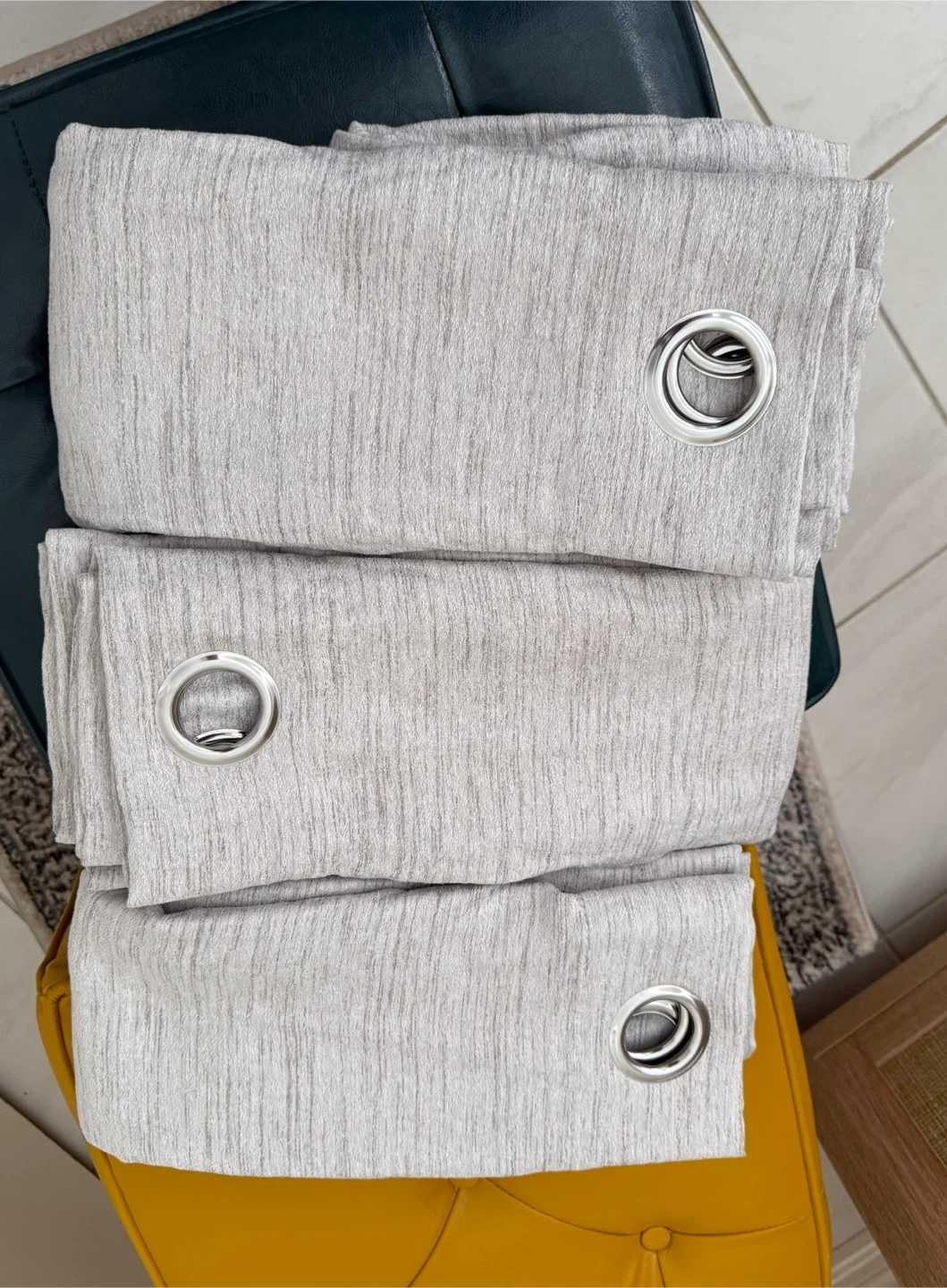 Set of three light grey eyelet curtains. They have a subtle textured pattern woven into the fabric. Includes silver-toned eyelets for hanging. These curtains would be useful for adding privacy and light control to a room.